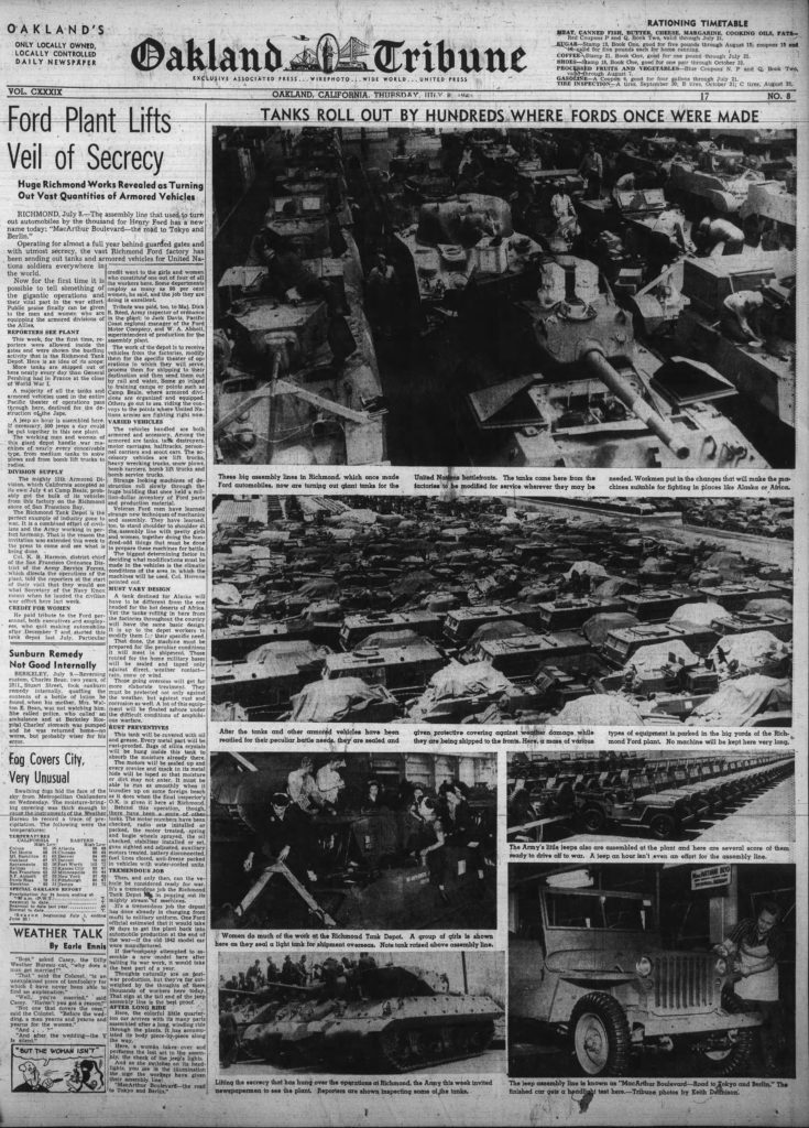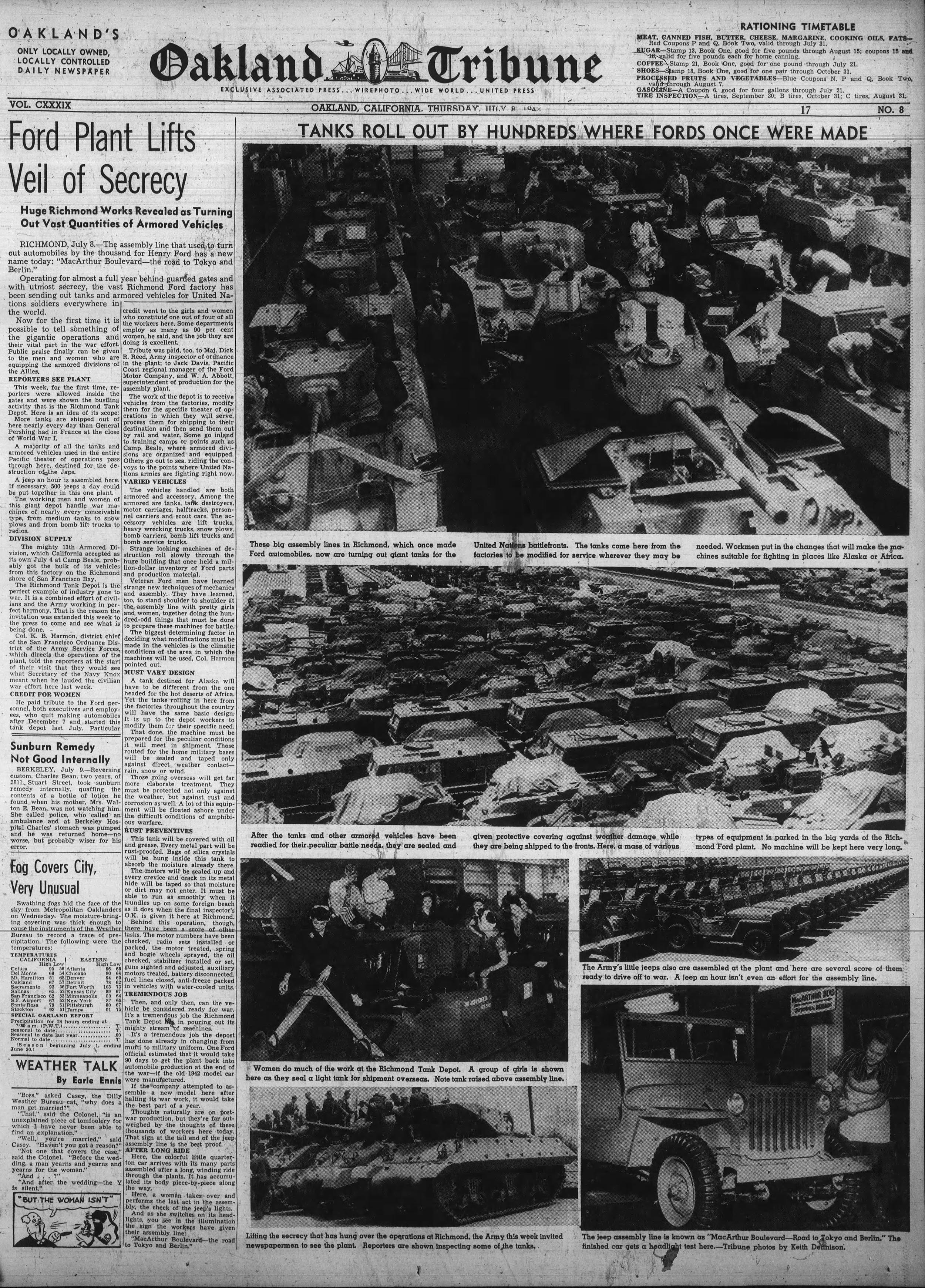 This July 8th, 1943, article in the Oakland Tribune shares information and pics on the Ford assembly plant in Richmond, California. Note the rationing table at the top of the page.