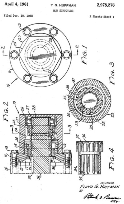 In December of 1958, Floyd G. Huffman filed a patent for a new type of hub structure. His patent, designed to “provide a hub structure that can be simply and quickly manually operated to release the front wheels so that they will rotate freely on the axles without the necessity of having the gears etc. rotate simultaneously when the front wheel drive has been disengaged” was finally approved in April of 1961.