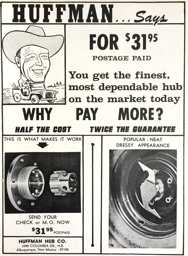Between August 1964 and May of 1965, Huffman advertised in Four Wheel Magazine. Perhaps by the summer of 1965 he’d built up enough dealers (150 in eight states), that he didn’t see the point of advertising? That isn’t clear.