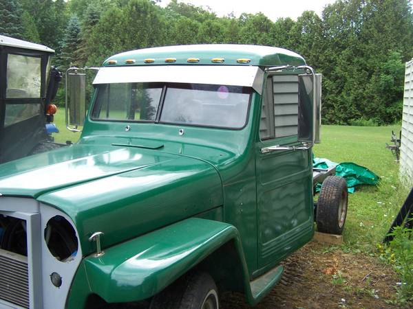 “62 Willys truck project on S10 frame with 4BDT turbo diesel and auto transmission. Was to be mini big rig look with all the lights, stacks, etc. Have many new parts, new aftermarket steering column installed, new master cyl, have many new lights, digital dash guages, chrome exhaust stacks, more too much invested and no time to finish, engine ran sweet when removed from working truck, also have stainless wheel simulators for the chevy 15 inch wheels, call for more details.”