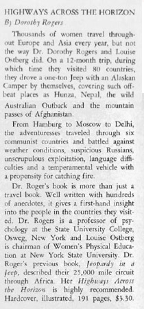 Originally Published October 06, 2012: Highways Across the Horizon was written by Dorothy Rogers, who previous wrote Jeopardy in the Jeep. I received a copy of it in the mail last week. I knew the book was about traveling through Asia, but there were two things I didn’t know. The first think I learned was that she and her travel partner Louise, traveled all the way around the world, starting and ending in New York. The second surprise was their vehicle of choice: a FC-170 with a camper. Craig confirmed today that Dorothy and Louise piloted only the third known FC to make it around the world. I can’t wait to read about their adventure.
