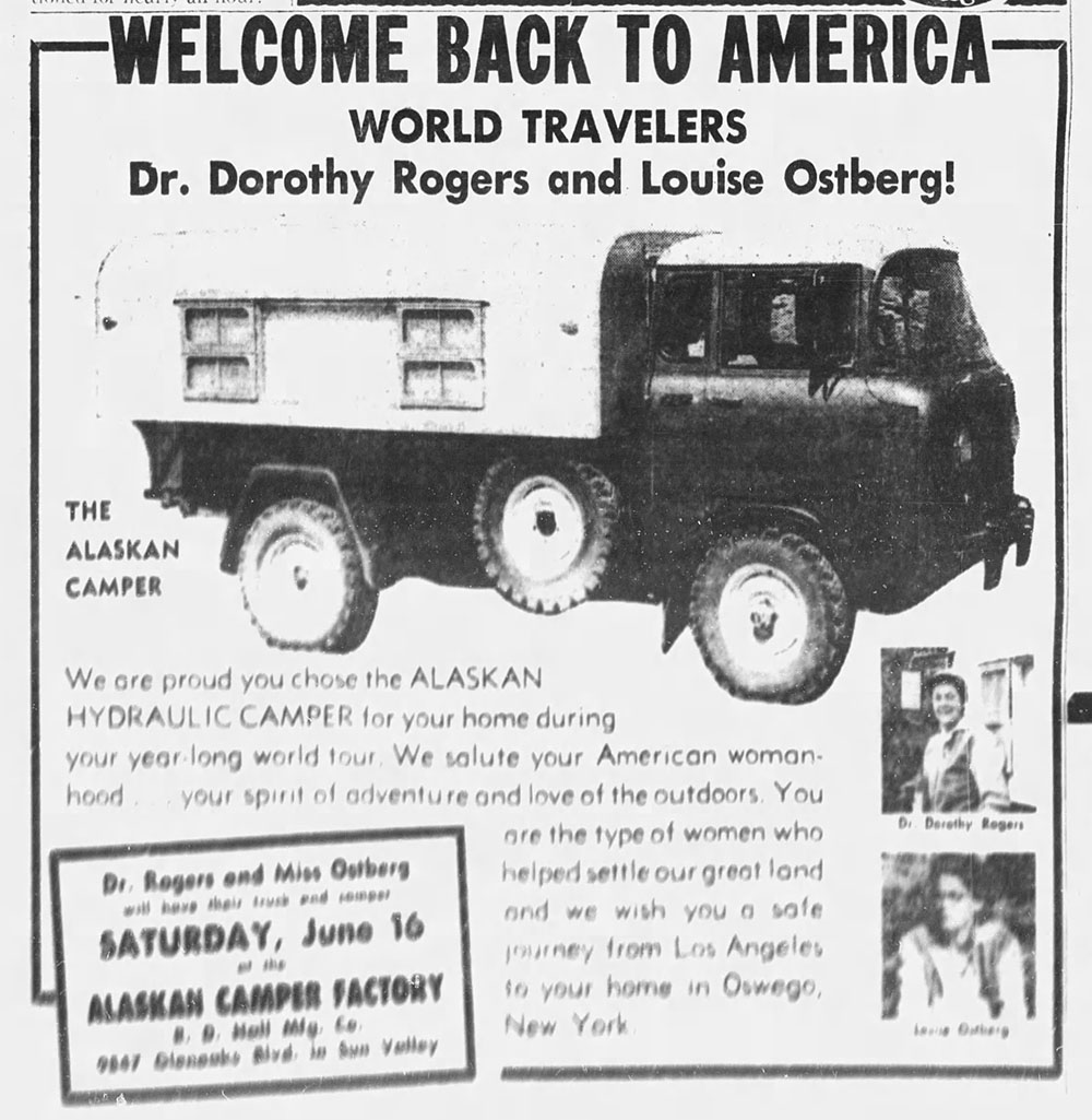 UPDATE: This ad published in the Los Angeles Times, June 15, 1962, by the Alaskan Camper Factory, welcomed Dorothy and Louise back into the United States after their trip around the world in an FC-170 (with an Alaskan camper, of course).