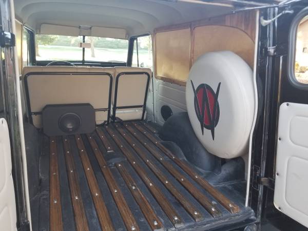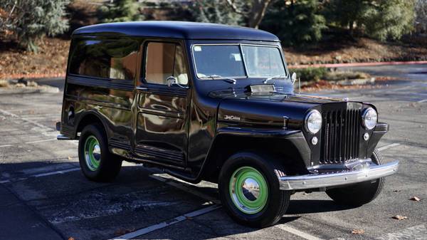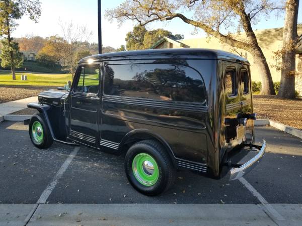 “1948 Willys Delivery (panel) – manufactured by Willys-Overland in the style of the World War II Jeeps. Underwent a ground-up, street-rod conversion in 2013 by Mariposa Street Rods where no expense was spared. The body was installed onto a 2002 Chevy S-10 pickup chassis, engine, and drivetrain (rear wheel drive). The Chevy 4.3 Liter V-6 has approximately 111K original total miles (80K +/- in original vehicle and 31K + in Willys). Features: air conditioning, electric parking brake, tilting steering wheel, seat/lap belts (2), driver’s side electric seat heater & adjustable lumbar support, leather upholstery, forward folding passenger seat for rear compartment access (original configuration), Alpine 8” touch-screen display in-dash GPS navigation receiver with satellite radio, power amp & sub-woofer (this system will blow the doors off!), back-up camera, manually operated original center front air vent, YOM (year of manufacture) license plate (rear only), front & rear interior dome lights, head light warning buzzer, new tires, Rhino lining coated rear compartment, and original steering wheel, glove boxes (3), ash tray, rear floorboards, window cranks & bumpers. This ride, interior and exterior, is total-fun; the body looks AMAZING from 10’ away; close-up, there are cracks and bubbles consistent with a 72-year-old vehicle – paint and body work needed.