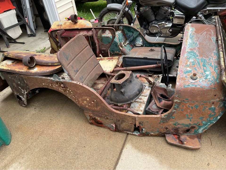 “1946 Jeep Willys project. No title. Has most everything you would need to do a ground up restoration. Frame in really good shape. Body a little rough. Have 2 sets of fenders, good, windshield and frame, grille, tailgate, tool box lid, gas tank, 1 seat, axels, engine, transmission and transfer case,l and 2 totes of miscellaneous parts.”