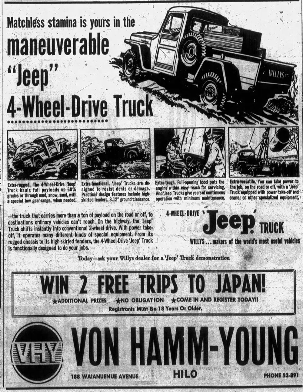 I thought this ad was interesting, as it promoted the chance to win two free trips to Japan, an offer that probably had little appeal, other than in Hawaii.It was published in the March 12, 1959, issue of the Hawaii Tribune-Herald.
