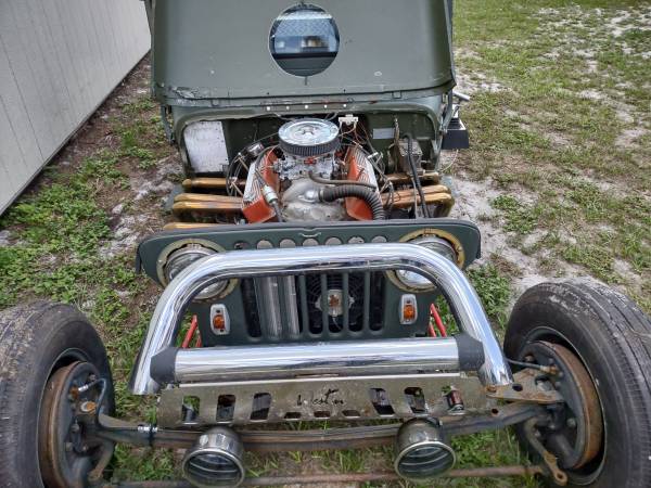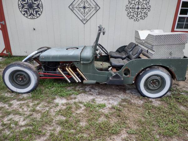“1949 Willys rat rod, 1953 V-8 Buick Nailhead, modified cam, edelbrock 600 carb. zoomie headers, 350 turbo 3 speed auto transmission, S-10 rear end on S-10 chassis. Suicide front end. all drum brakes. Lots of extra parts.