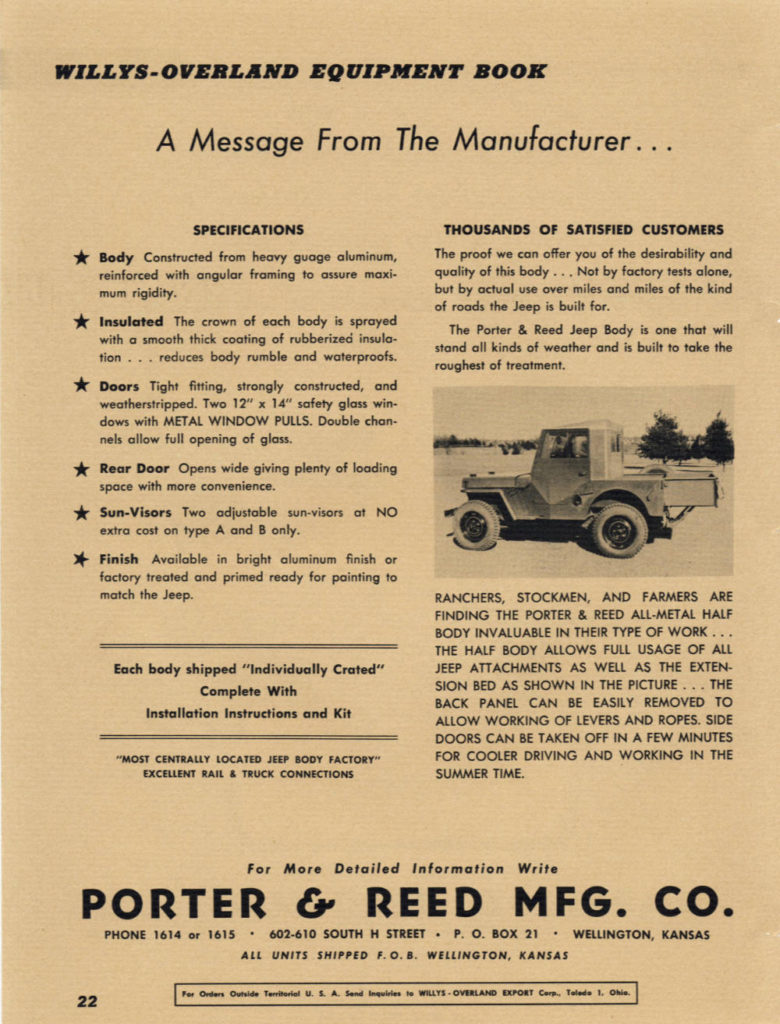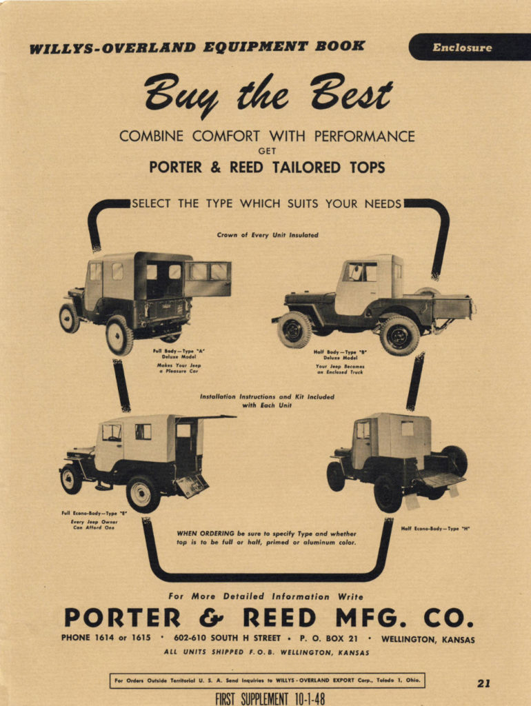 I’ve also included both brochures from the 10/1/1948 First Supplement of the Willys-Overland Special Equipment book (Besides full and half tops, Porter & Reed also manufactured bed extenders). (Learn additional info about the tops on the CJ-3B site)