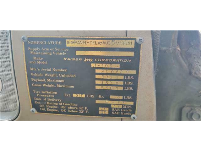 “Available for you to consider is a 1967 Kaiser Jeep 4×4 6cyl w/3spd manual 3 on the tree. This vehicle has been stored away indoors for years. Engine spins freely and will run you will need a radiator , carb rebuilt, 2) 12 v batteries (24volt system) most likely clean up brakes and will need fuel system flushed with new fuel. This is a very rare unique vehicle. This Jeep was used in Vietnam for Audio Visual. This Jeep is out of Fort Knox. I really know nothing of this particular history of actual usage and very little information to be found on the web.