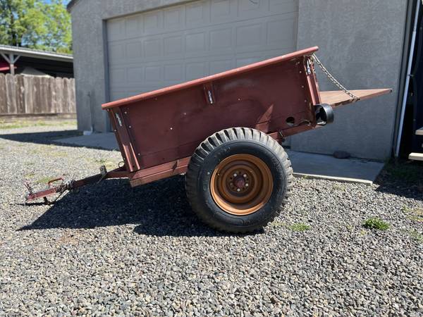 “”Bantam” style trailer with cut-down Willys box-bed 48″W. x 54″L. New (military jeep style) tires. The box is hinged to tilt 30 degrees or more.”