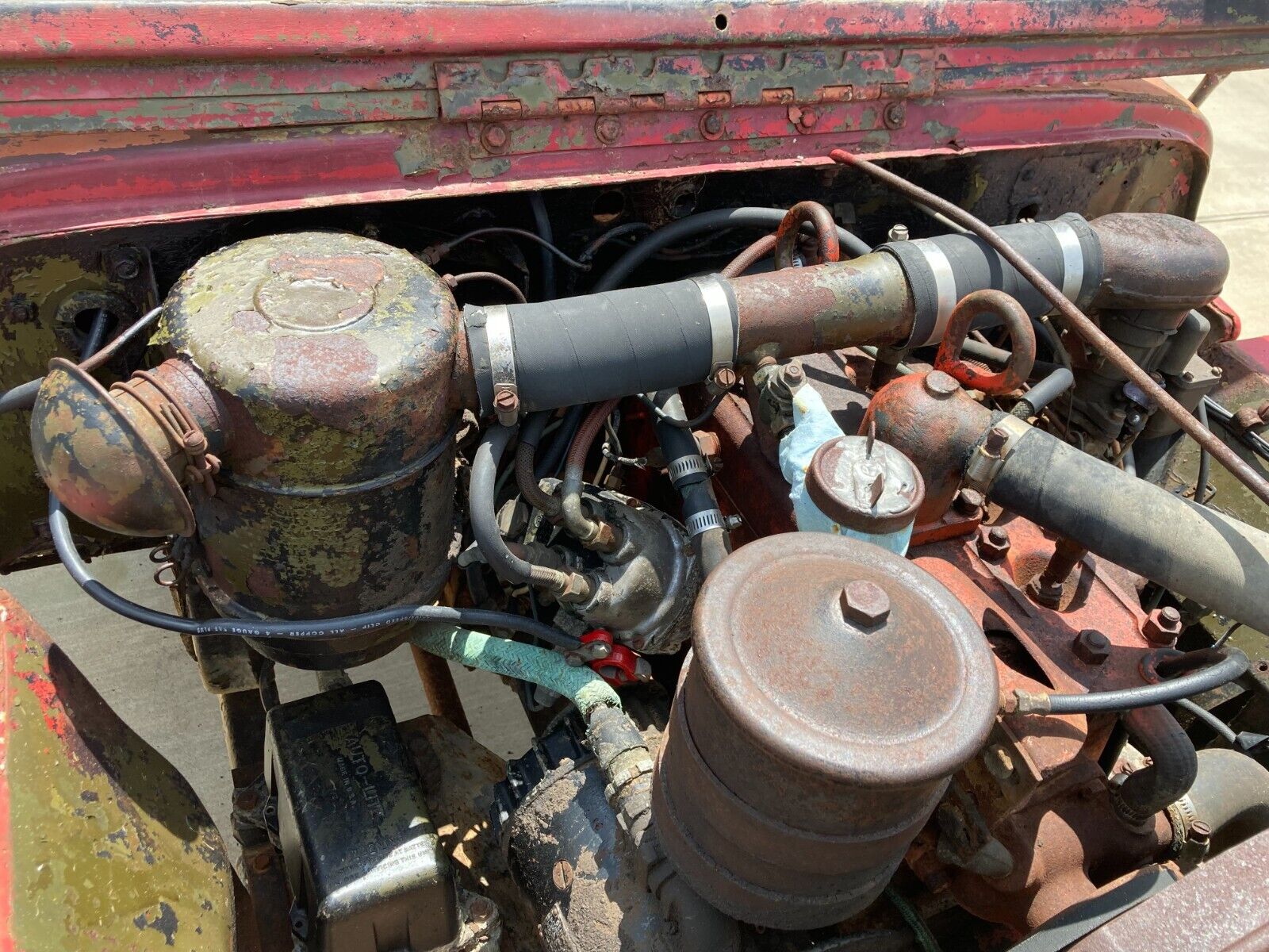 A lot of the critical parts you will need are still on the Jeep. The body and fenders are very straight. Hood includes the snorkel hole plate. Only known filler is the passenger side rear corner. It will need a new floor to restore. It has all of the major electrical parts (starter, regulator, and generator). Other parts present include floor plates, correct seat frames, new glass and gasket 5 years ago, proper original and correct M38 oil bath air cleaner, crossover pipe, front shackle brackets, etc. It has 4 of the original and correct wheels. Very old tires (including Mohawk Chief and U.S. Royal) need to be replaced, although current tires do hold air.