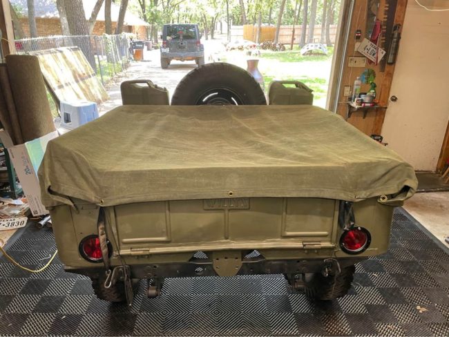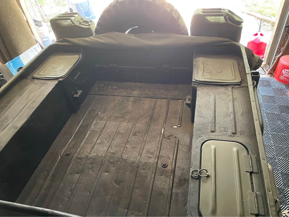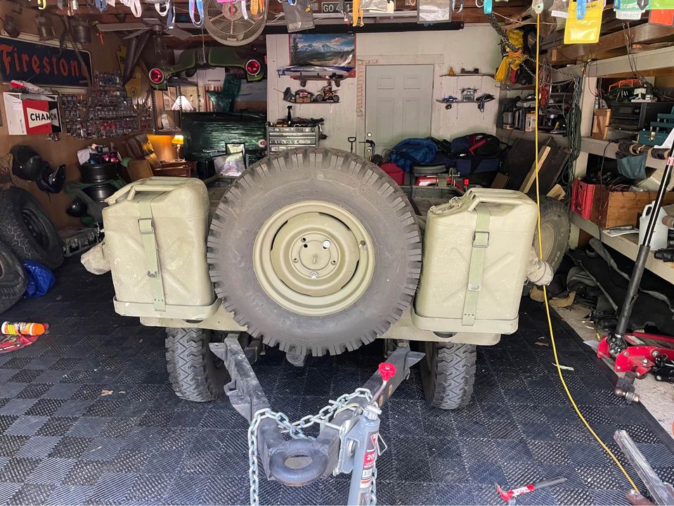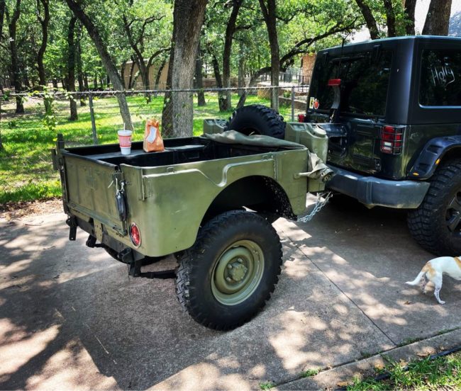 “Sweet Jeep trailer. Made from 2 Jeeps. Comes with 2 Jerry cans w/mounts 3 new tires including full size spare, waxed canvas cover included. Pintle receiver included”
