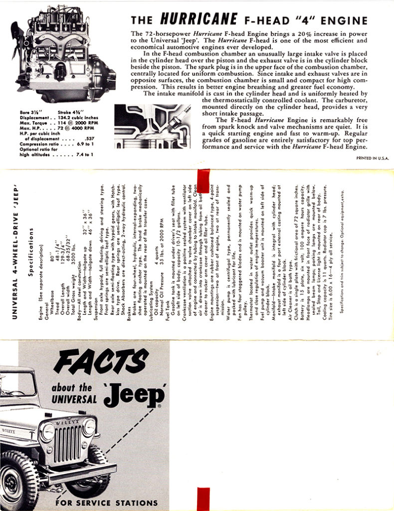 This Facts About the Universal ‘Jeep’ For Service Stations mailer lacks a form number. It also lacks the KW stamp that is seen on the others. Finally, it labels the f-head as a 72-horsepower engine, while the other mailers have it marked at 75-horsepower. Given the changes, I’d guess this “Facts” brochure was the first one of the four printed: