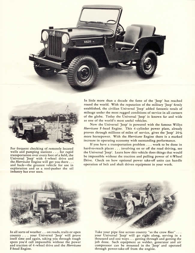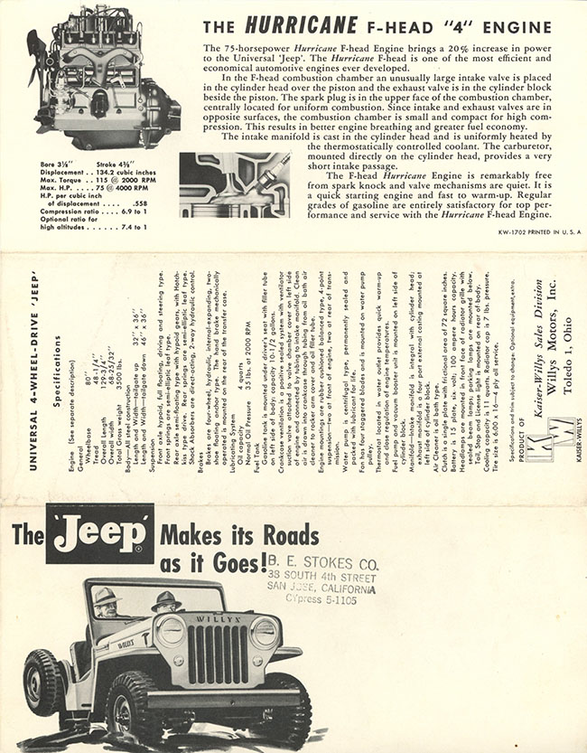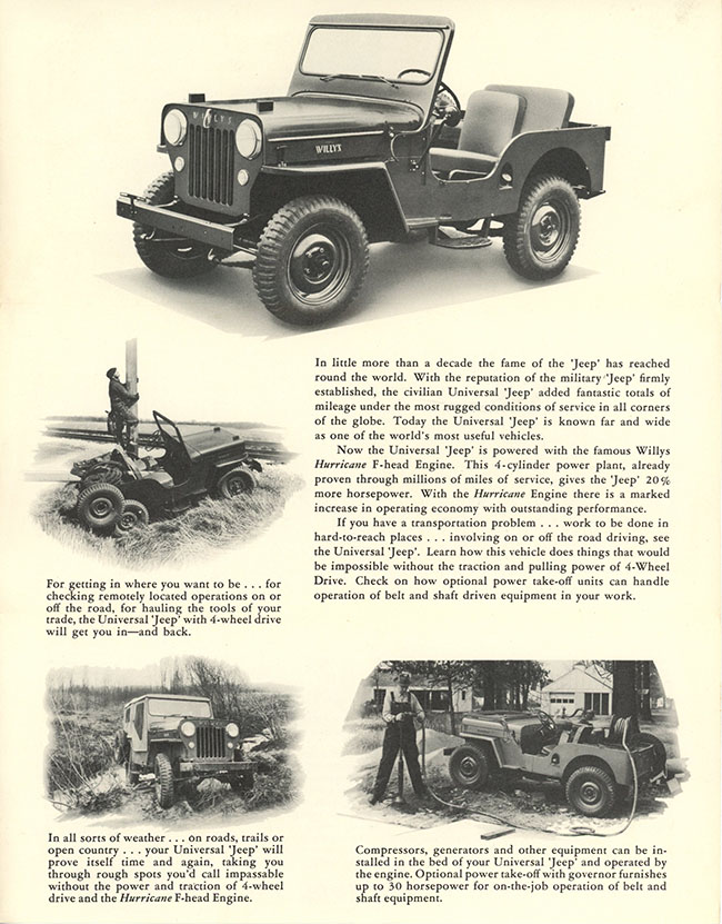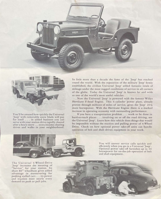 UPDATE: This redone post now shows the four single-page double-sided tri-fold mailers published by the newly established Kaiser Willys marketing team. The first one, “Facts about the Universal ‘Jeep'”, does not have a form number, but the others do. Much of the content is recycled from mailer to mailer.