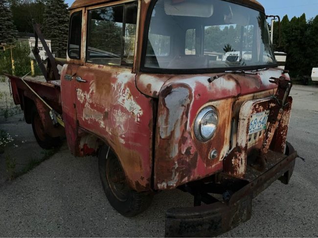 “1958 Willy’s/Jeep Forward Control FC-150. Rusty but complete. Doesn’t run. Engine is apart. Rolls. Title. $1900 cash only. Pick up in Mayville.”