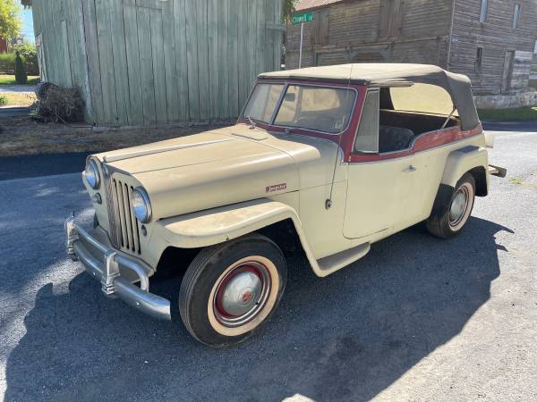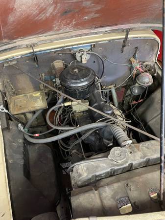 “1949 Willys Jeepster VJ3. I was told the car originally had the 4 cylinder engine. The gentleman I purchased from replaced it with a 6 cylinder engine which I was told was from a Studebaker. It is actually an F-161 from a 1952-54 Willys Aero or Wagon. He thought the car was under powered with the 4 cylinder. Manual transmission with overdrive. Car was also repainted from the original blue to the cream/red color. Not currently running. I had it running 20 years ago for what it’s worth. Engine turns over. Interior is in good condition with original rubber floor mat. Side curtains are there as well. Solid condition. A good cleaning would have it show well or it’s ready to restore back to original. Asking $7,500. Located in Greencastle, PA. Not far from Carlisle and Hershey car shows.”