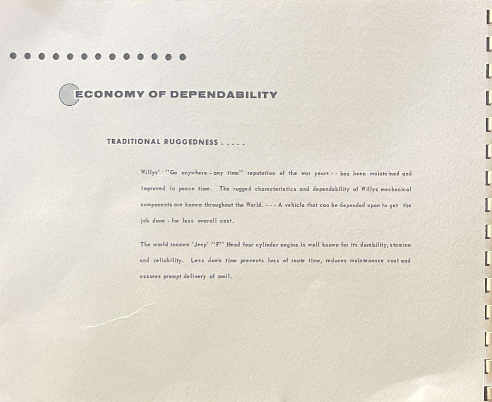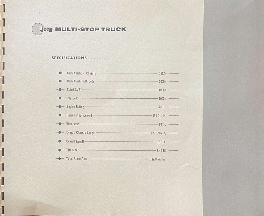 I finally snagged this “Jeep Multi-Stop Truck” brochure off of eBay. It is only seven pages. There are no details provided about the chassis used, but it does use the F-head.