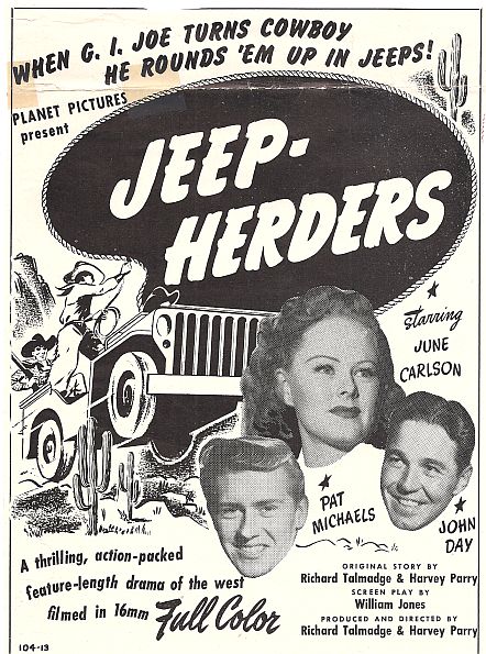 In 1945, Planet Pictures, a new venture founded by two stuntmen, produced it’s first movie: Jeep-Herders, a full-length movie shot in color on 16mm film. Planet PIctures’ goal was to produce movies that could bypass theaters for play in schools and churches, as 16mm projectors were very common at the time and much cheaper than the 35mm projectors. In addition, there was growing interest in 16mm for large audiences, as an industrial film on 16mm was shown to a crowd of 6000 in 1945. (click on this link and scroll down a page).