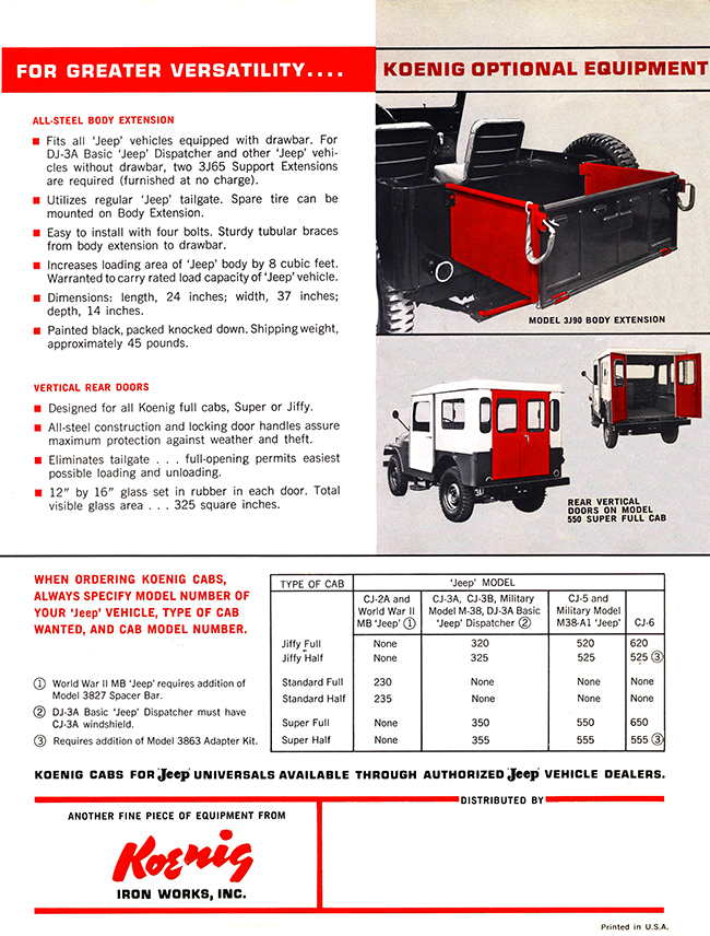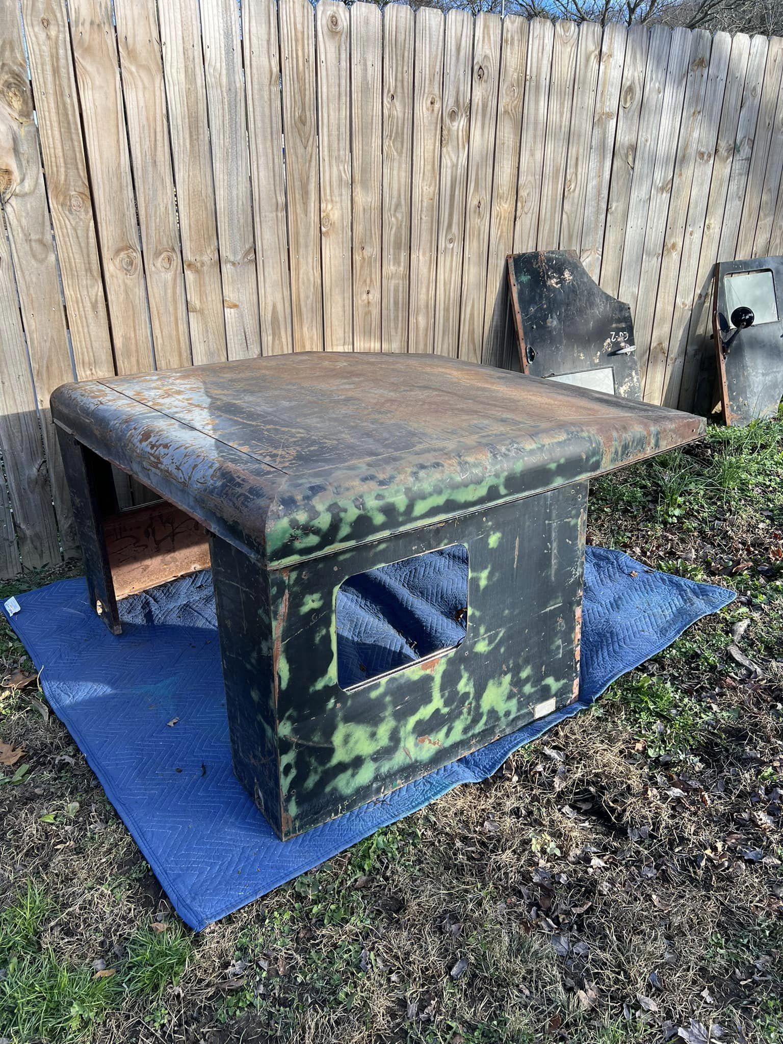 “I have three complete Koenig Model 330 steel full hard tops for sale. They all fit CJ2A’s. Normal wear and tear for 70+ yr old Jeep tops. Only rust through are minimal spots on a couple of the sections that bolt to the tub. Two exterior door handles missing. All interior window mechanisms complete and present. The black top has rare rear ambulance doors.