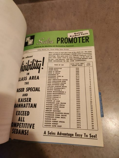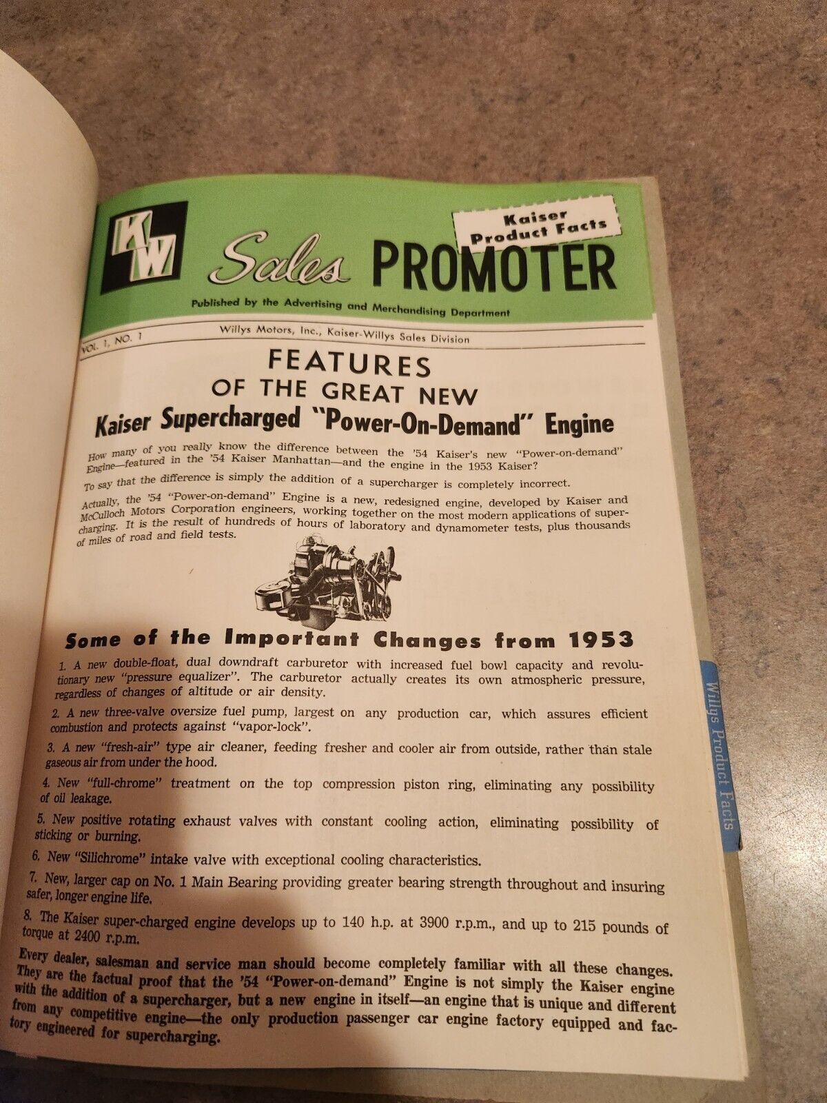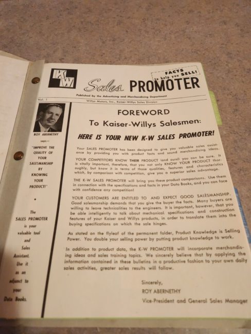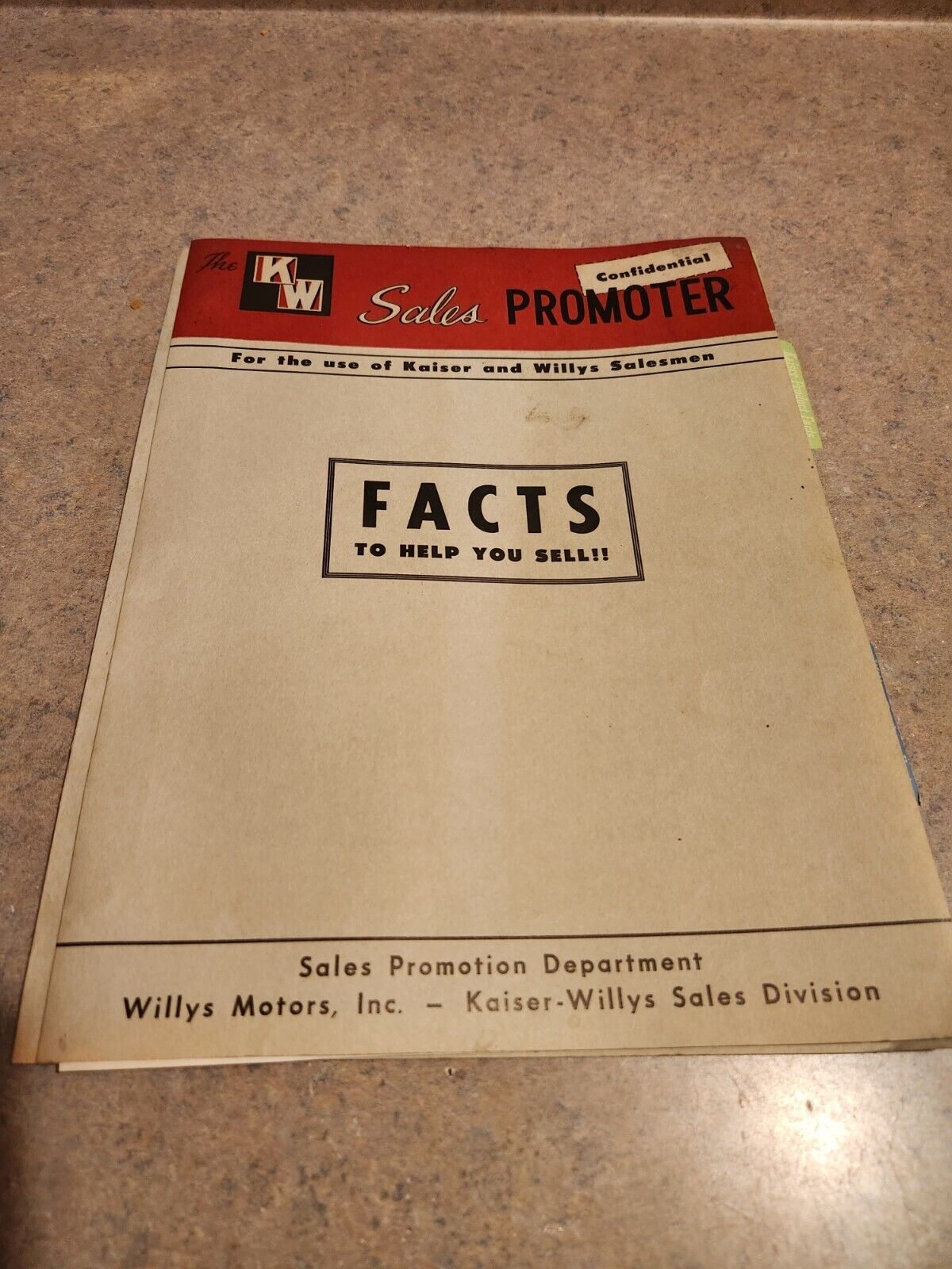 “Kaiser Willys Sales Promoter Bulletins. From a closed down dealer, here is a book of sales bulletins for Willys and Kaiser Sales people.”