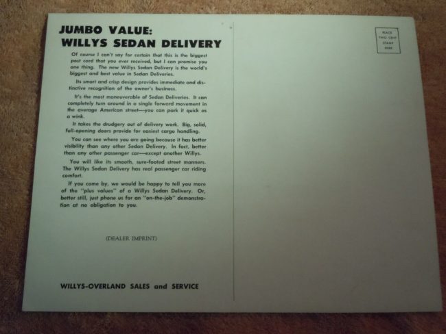 “THIS AUCTION IS FOR AN ORIGINAL 11X81/2 INCH WILLYS JEEP SEDAN DELIVERY WAGON DEALER SALES POSTCARD