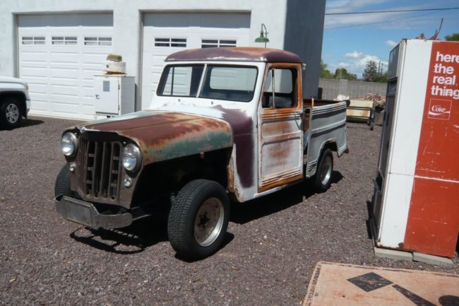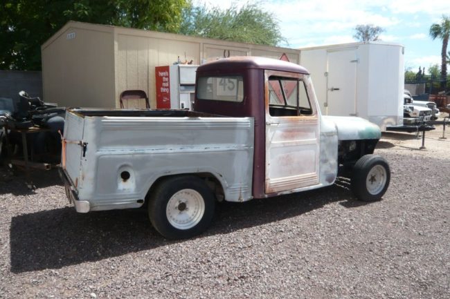 “1959 Willys, Jeep, 2WD, Custom made fleet side bed, No front fenders, No seat, Custom bumpers, Center line wheels, new tires but older. V8 318, AT, dodge rearend, motor and trans are good but not running now. Good start on Rat Rod project, Hot Rod, pickup, truck. $1900.00 OBO,”