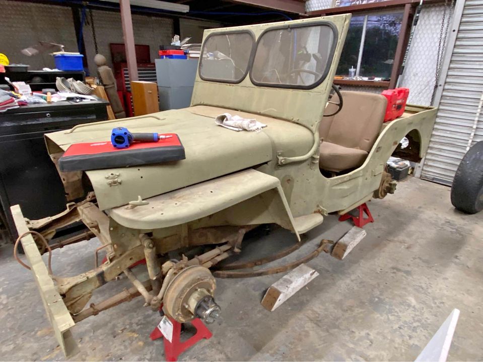 “Here for your consideration is an April 13th, 1943 Louisville, KY production Ford GPW 1/4 ton jeep. Disassembly was begun so there are some loose parts. Perfect restoration project. Has all four wheels (post war CJ rims with modern street tires) but not pictured. Has a post war early CJ motor that is not seized up. I purchased this almost two years ago but with two other WWII jeep projects this one has to go.”