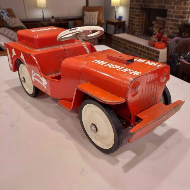 “Vintage 1960 Structo ride on fire chief Willys model Jeep. This is a large and heavy steel ride on toy that measures approximately 25 3/4″ long, 10″ wide and is 1 ft tall. It is missing the siren and has minor expected play wear. Looks great and all other features work. Wheels roll smooth, large storing compartment in rear, steering is smooth and it displays very”
