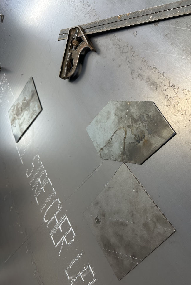 This first pic shows 5 1/2″ x 5 1/2″ 16 gauge steel squares. The paper above it shows my attempts to figured out the rough size I wanted: