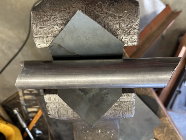 With the bend started, I open the vise, place the piece on the vise with the center bend down, then place a tube over it. Using a small sledge hammer, I carefully whacked the tube, causing the metal to collapse.