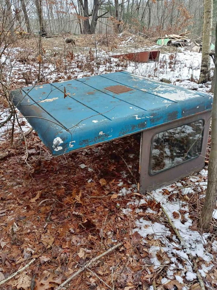 “Steel hardtop for early Jeep CJ5s. Fits 1955 through 1970ish. I believe this is a Meyer brand top. Its all there, glass is good, some rust through on the mounting ledge, patched hole in the roof. Comes with a pile of doors, rusted but useable. 300 bucks for the top and doors.”