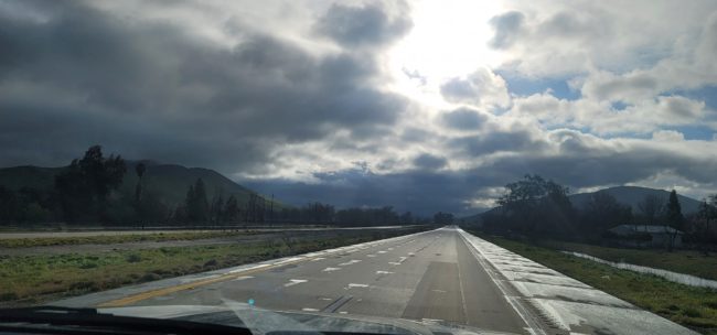 With the sign stowed in the truck and the frame secured in the back, we were back on the road. However, we quickly realized we were going to have issues getting out of Bakersfield, because the electronic signs dotting HWY 99 read things like “AVOID TRAVEL” and “HWY 58 CLOSED” and “I-5 CLOSED” and “FIND ALTERNATE ROUTE”, the latter of which confused me because there wasn’t an alternate route unless we went west to the ocean, down hwy 1, then cut back again, which would add 100 hours or so to our drive (a slight exaggeration, but still …).