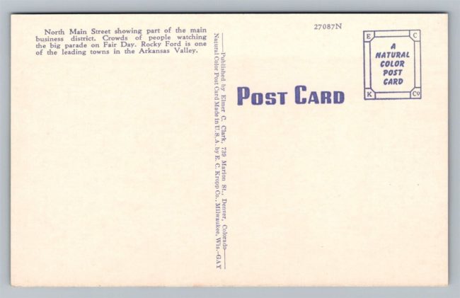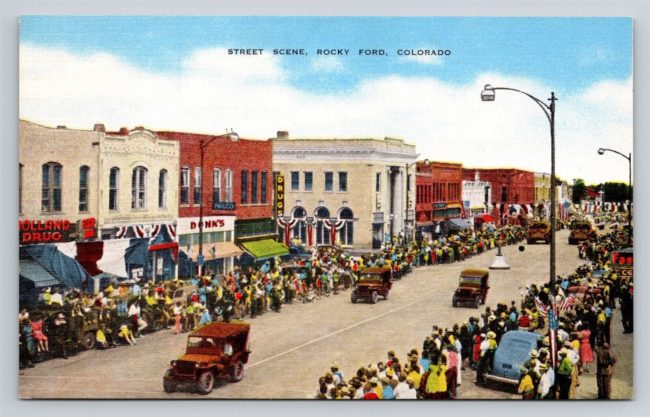 “Rocky Ford CO Street Scene Main Street Signs Downtown Old Jeep Vtg Postcard View