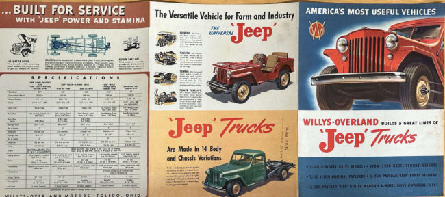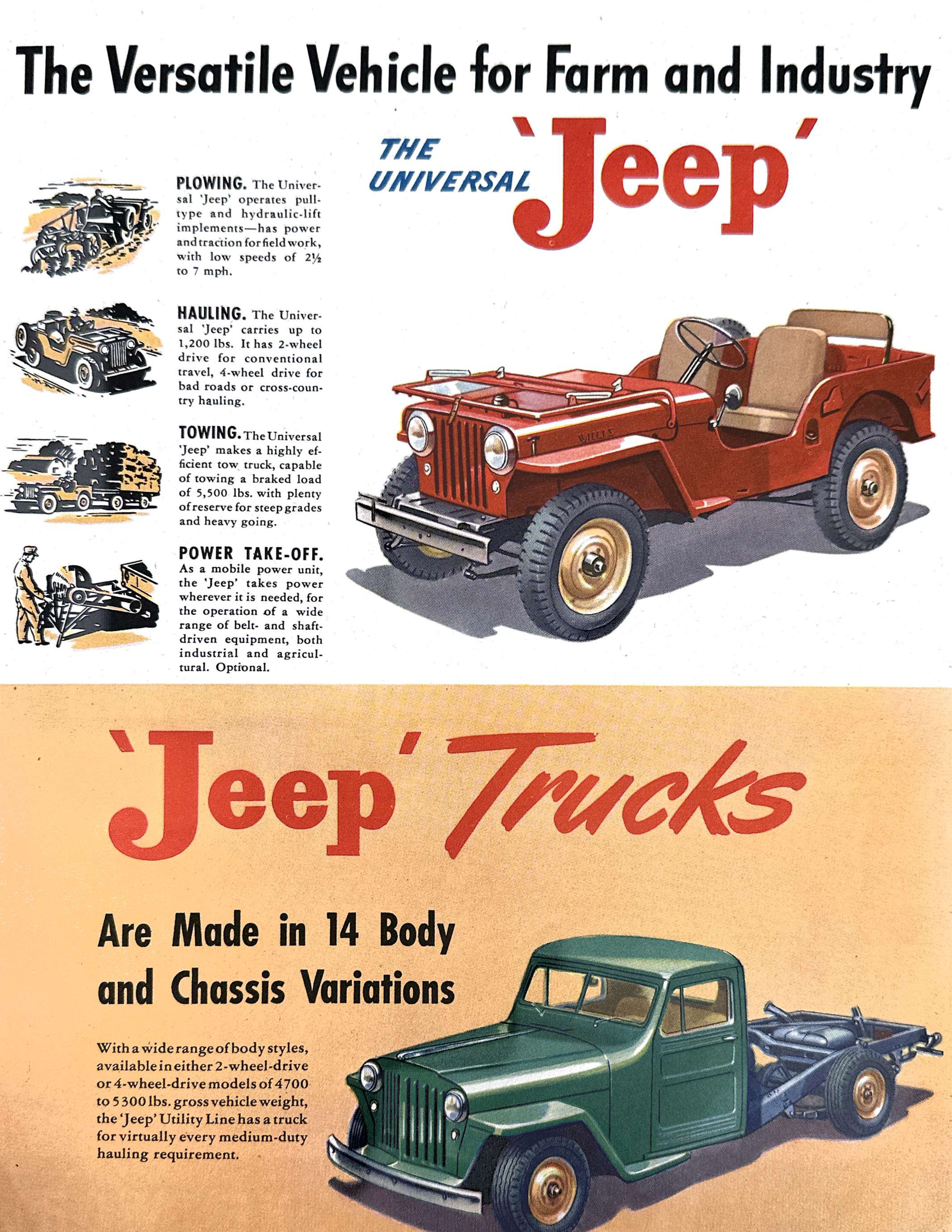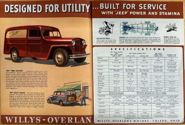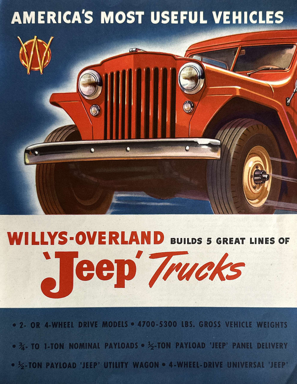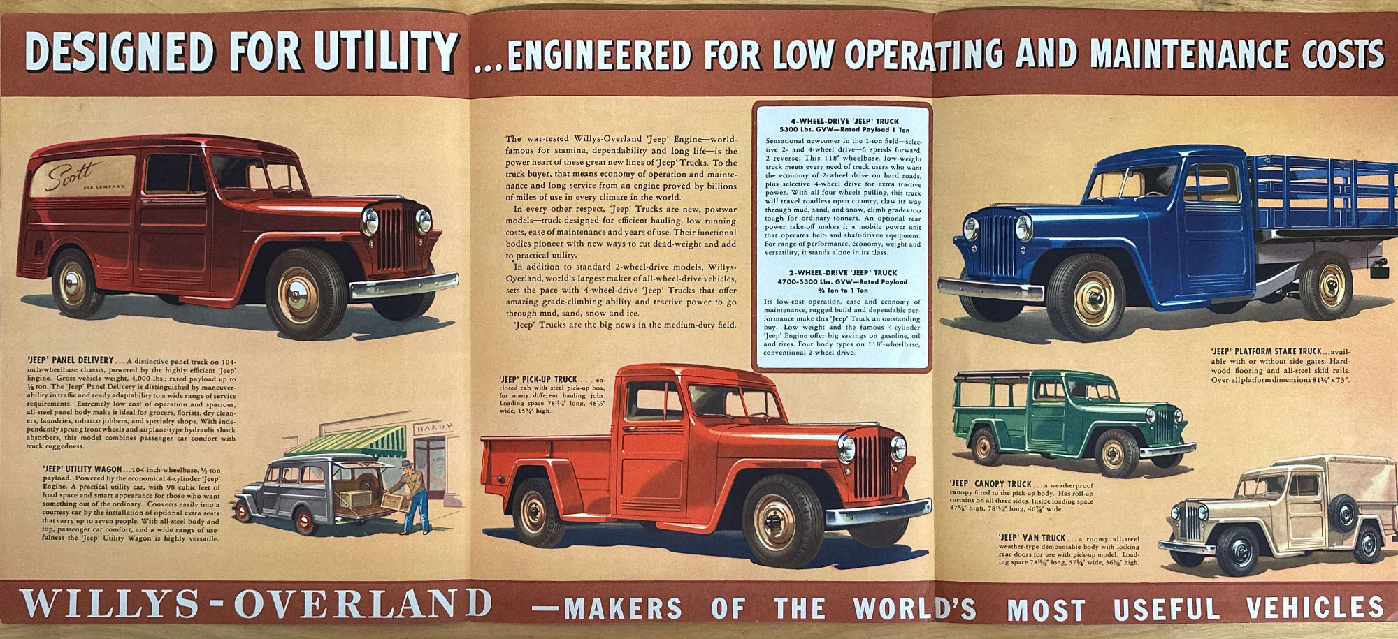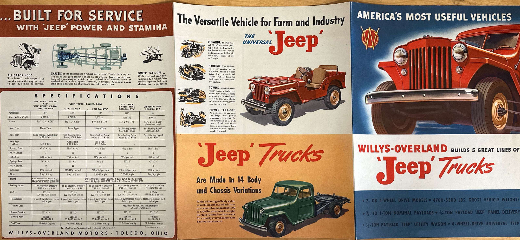 Willys-Overland produced a July 01, 1947, brochure featuring its family line up of vehicles. The following year, on July 01, 1948, the company reprinted the brochure with a few minor changes and it was printed on a glossier, thinner paper. So, when buying this brochure, make sure to check the date of printing.