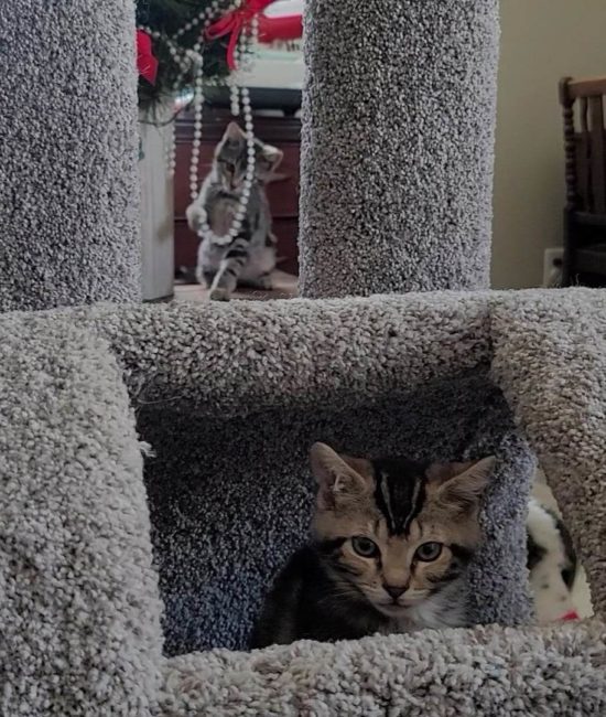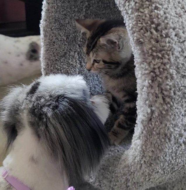 The kittens seem willing to be friends at this point (fingers crossed). They are cuddling with one of the dogs as I type this. Lizzy tends to love a little too physically (she got Tom Cruze trained early on). We’ll see if she can back down a bit (she’s just too happy).