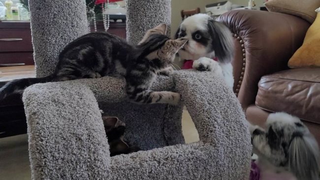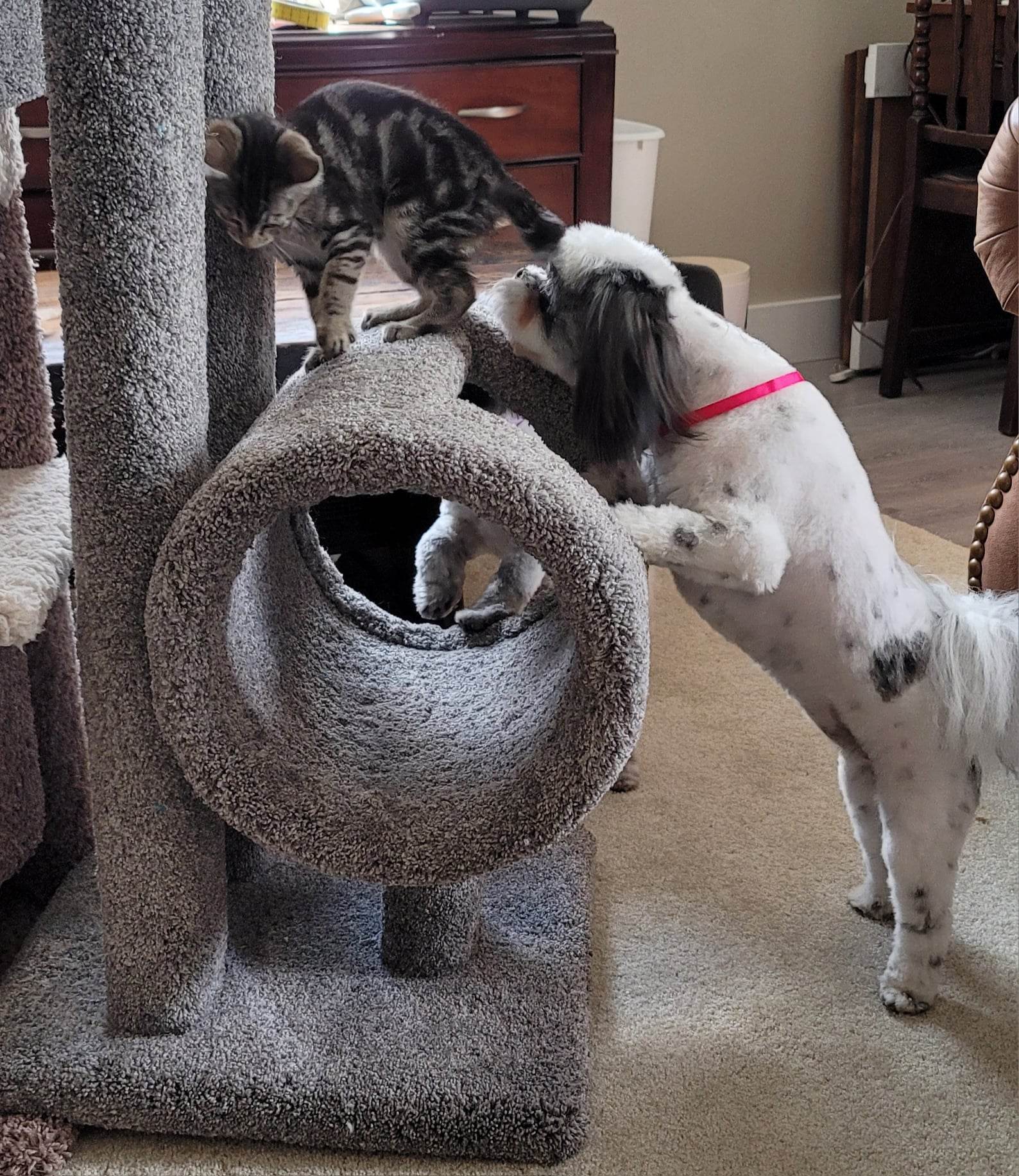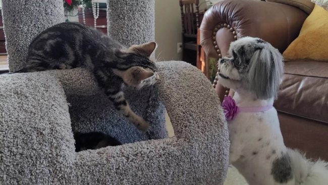 It looks like the dog thinks he has a new play friend. My Shih Tzu thought he gained a new play friend when the cat moved in. He quickly found out that the cat didn’t want to be bothered.