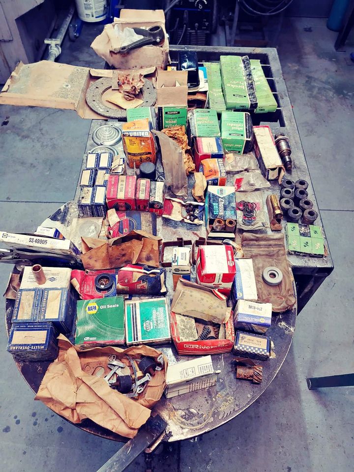 “This is a mixed lot of OEM & aftermarket Jeep parts for the Hurricane engine, CJ2A and CJ3B. There is some surface rust on some of it but everything looks to be usable. Some just need a little emery cloth cleaning up. The bell crank is the 3/4″turn down and costs $300 by itself, the install kit is there for it also. I didn’t unbox everything and I don’t know what everything is. There are small parts envelopes with little pieces that feel like roller bearings. There are Rod & Crank bearings, intake valve, wheel bearings, axle seals, 4 new wheel cylinders, multiple wheel and master cyl rebuild kits, all brake hoses and junction blocks, rebuild kits for the 3 different style of pivot eye bushings, distributor cap, rotors, piston pin clips, needle roller bearings, distributor and oil pump drive gears, voltage regulator, OEM temperature sender (I don’t believe is available anymore), headlight switches, carburetors, U bolts, and some vacuum switch thing. Selling as a package deal preferably. Firm on price.will ship at your cost.”