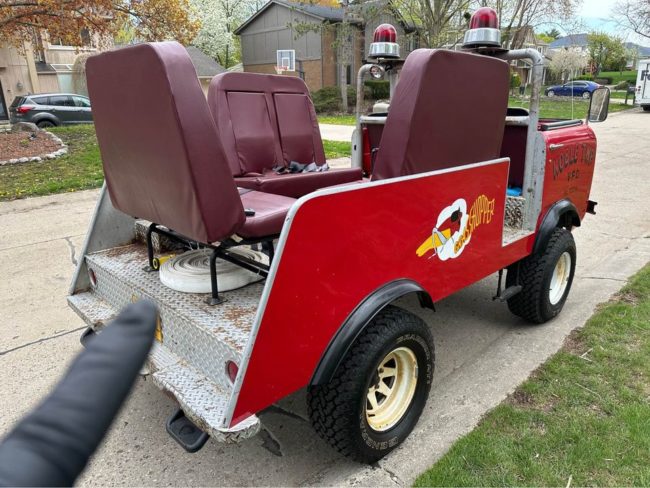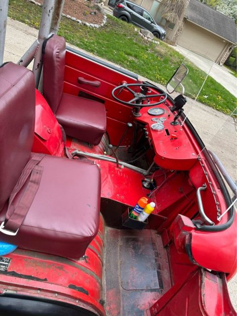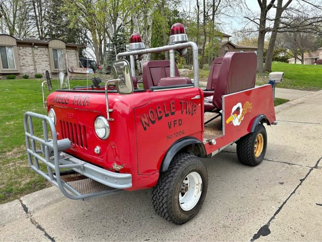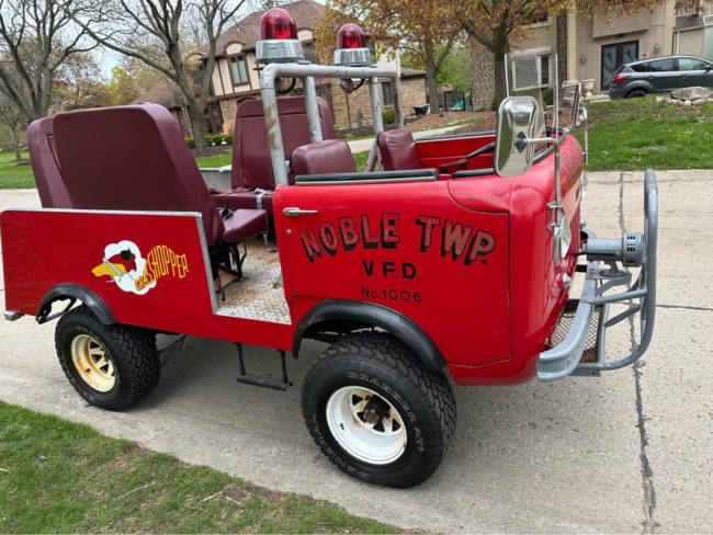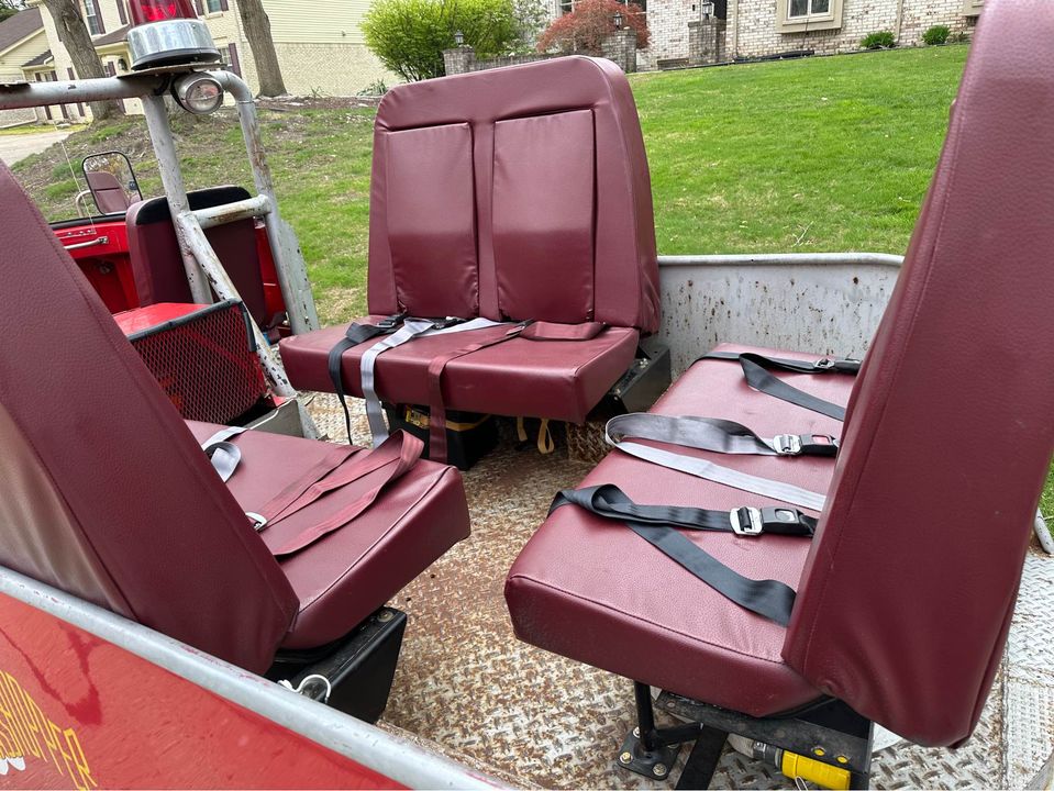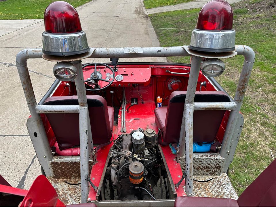 “1960 Jeep FC-150 Brush Fire Truck was created by the Noble Township Volunteer Fire Department in Ohio in the late 70s. We bought the Jeep not running. We had a local shop (Wrenchers) clean the fuel system, install a gas tank, and service the brakes (6 years ago). The engine and drivetrain is overall stock/original and does leak a little bit of oil. The Jeep was lifted, with blocks, to deal with the larger tires and the off-road terrain it was modified to run on. We adapted an additional electronic fan to help with cooling during slow parade routes. All head/turn/running lights work, and the emergency lights and siren also work. Each of the 3 benches in the back has 3 seat belts, or two booster seats. This is the Only FC-150 I have ever seen with this type of cab/bed modification, and it is a blast to drive in parades and around town. Top speed is around 44 mph. Large dent on front driver corner shown in the last photo. No body/frame rot. Normal surface rust underneath”