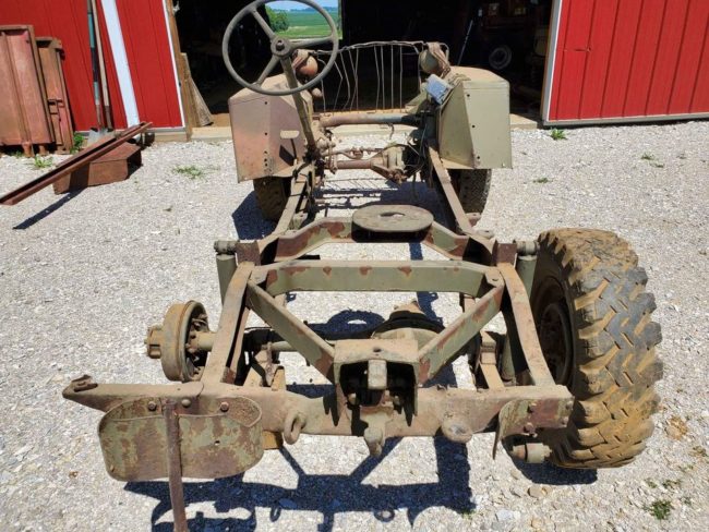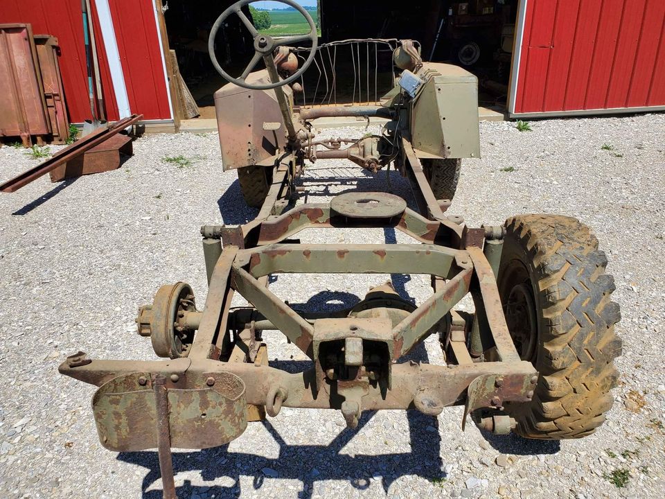 “41 Slat grill MB project. This is has been a running, driving jeep for years. I am selling but have pullet the motor to put in another jeep. The T84 trans has the passenger side fill hole (correct for slat). The current frame is kinda cobbled up, a 2nd slat grill frame with axles & original slat grill is included. Seats are repros with Beechwood Canvas covers, a set of original split-back seats are included. Four 4 1/2″ 90/90 solid wheels and one 4″ 90/90 solid wheel go with. Also included is a chain drive 638632 block that i believe to be an actual slat grill motor (turns free) and 639660c cylinder head. The registration number on the hood is not original, dod tag and frame tag are missing, but the ser# on the title matches the features present on this jeep, I believe it to be the correct ser#. I have estimated the dod to be Dec 19. Clean title in my name. Serious inquiries only please. Located in SW Indiana, delivery available for a fee.”
