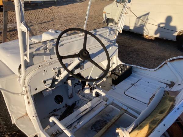 “Cool Flat Fender, CJ2A, Big trencher, Double PTOs, 4 Cylinder, Beefed up frame, Very complete, Just Bought it a few months ago and was going to take the body off for my jeep project but can’t bring myself to disturb it’s completeness, may trade for a nice CJ of equal value!”