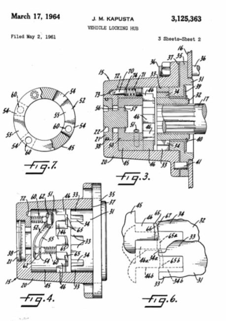In May of 1961, John Kapusta filed for two Cutlas patents a couple weeks apart. First the company filed this patent, an attempt to make hubs easier to use. I cannot find evidence that the company manufactured this one. The goal of the new Cutlas hub was to eliminate the jamming that sometimes kept the hubs from engaging or disengaging, making it easier to operate.