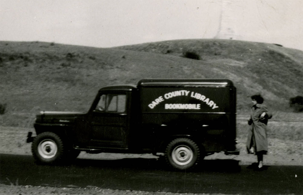 Dare County purchased it’s first jeep in 1950, hence all the photos and news articles on this post. According to the library’s history page: “After the war, the library continued to grow. In 1950, the first bookmobile was purchased – a green Willys Jeep converted for this purpose began making regularly scheduled runs. As there were then no bridges from the mainland or to the Outer Banks, all trips involved ferries. Georgia Harwood retired in 1956, succeeded by Jean Turner Ward, who served as librarian for the next fifteen years.”