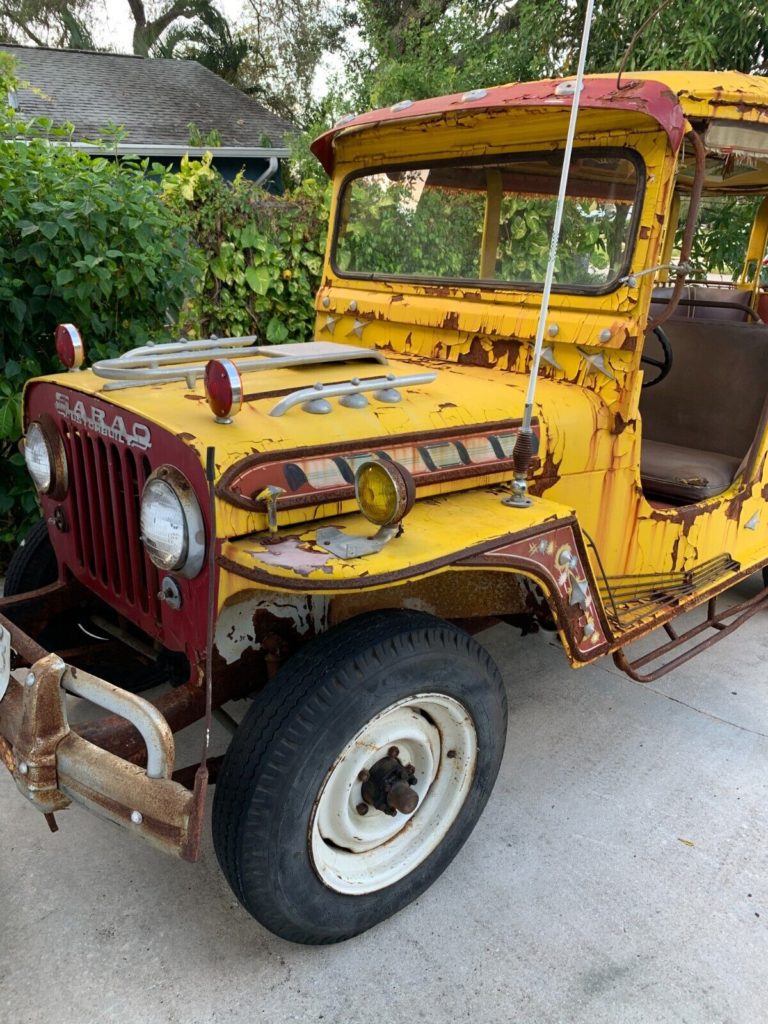 “1950s Willys Jeep Phillipines Sarao Jeepney Rare Tourist Buggy Taxi Mini Bus……Here’s a cool project for you Jeep fanatics. No title. I will provide bill of sale. This Jeep needs complete restoration as you can see. There is one dent on the roof at the left rear corner, the rest of the body is straight. The body has surface rust and the skim coat is crackling all over, but it’s very solid. The vast majority is surface rust. The floors and frame are solid. The only rot I see is at the roof seam over the driver area. The other side of the car at the roof is solid. It is very complete. The only items I see missing are two hubcaps, one interior ceiling panel, the passenger seat cushion and maybe a few small bits. I’m not sure exactly what year it is, but I believe it is from the 1950s by the details I looked up on Sarao and Jeep websites.