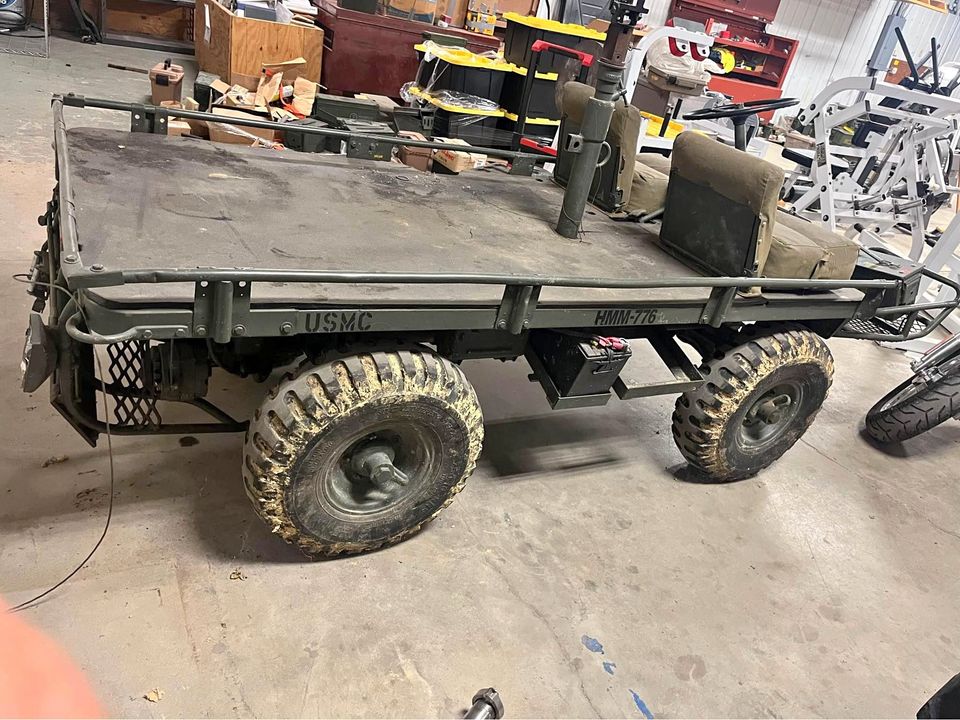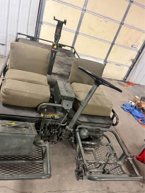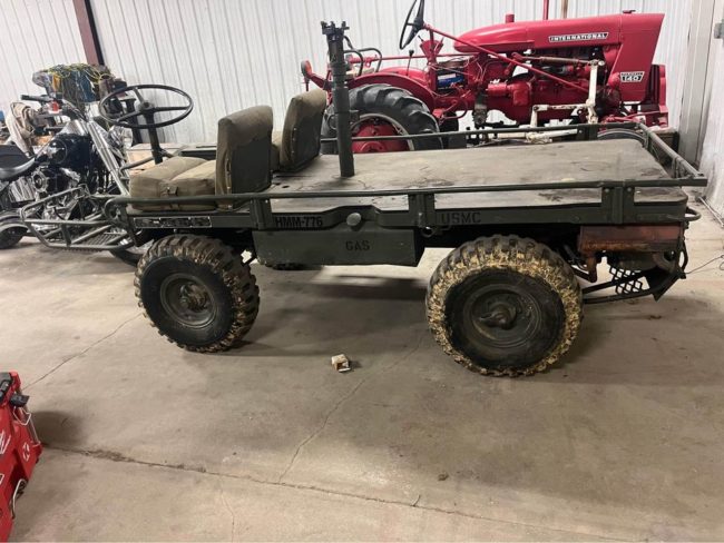 “Runs good, drives good, will take you anywhere. It’s a 1958 M274A4 mule with the magnesium frame, and a 2 cylinder Morse Fairbanks engine produced by Brunswick with only 189 hours, 3 speed manual with high and low. Also equipped with 4 wheel steer, and full time 4X4 and everything works. Comes with a winch, trailer hitch, has tons of lights. Everything on it works as it should, may need a new battery.”