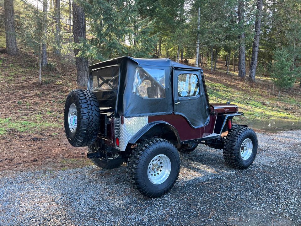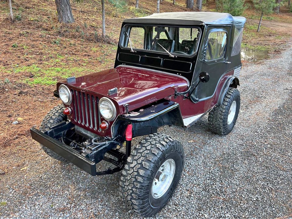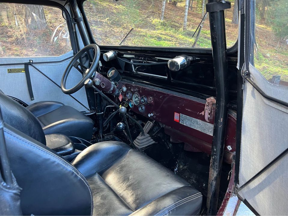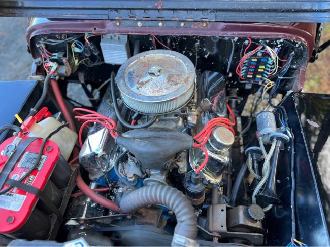 “1949 Willy’s Jeep 289 Ford V8 with Holley fuel injection carburetor. 4 speed Granny low Warn overdrive Dana 44 axles with posi in rear. Power steering Disk brakes on front axle, drum on rear. Has custom aluminum large fuel tank under rear seat. 33×12.50 tires about 90% tread”