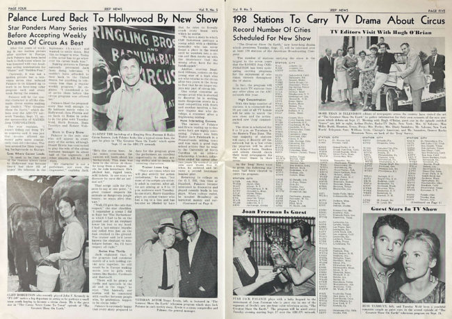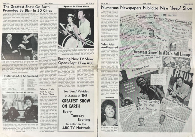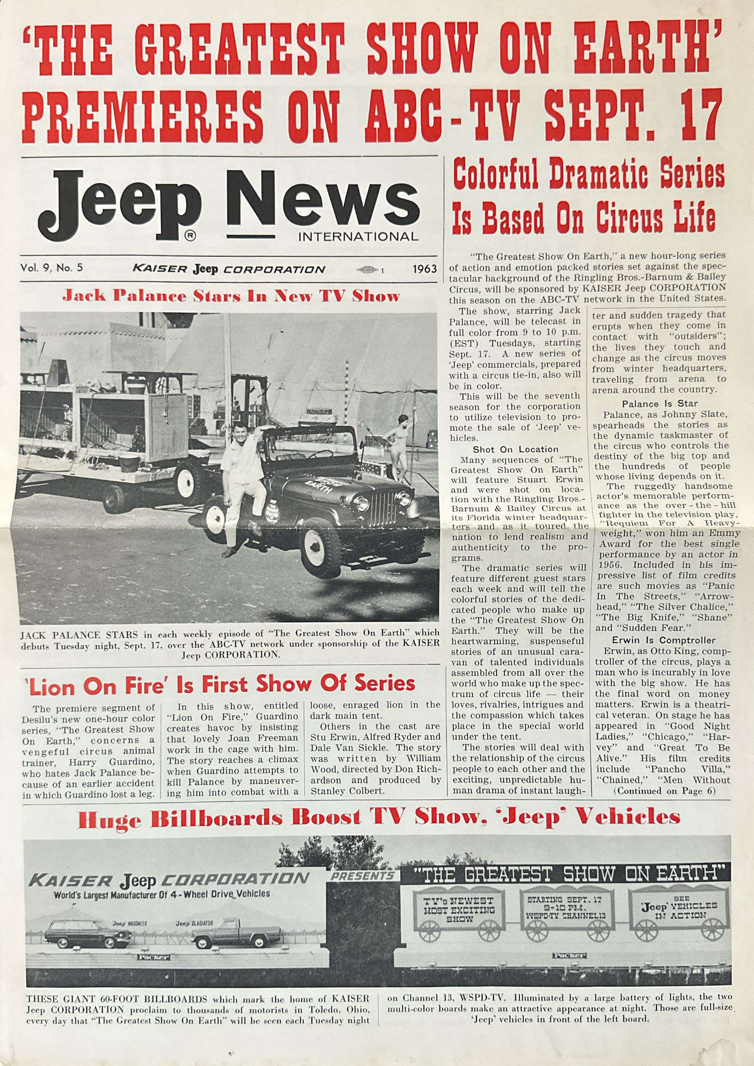 In that short time span, I enjoyed watching this show on our black & white TV, not only because of the Jeep sponsorship, but also because I admired Jack Palance as a actor. On my weekly bicycle rides to Scheuer Motors, I would ask for Greatest Show On Earth brochure, week after week, and never seen at Scheuer Motors, in fact, they never ever featured any advertising connected to the show. I never knew why, maybe they knew the show was doomed to failure.