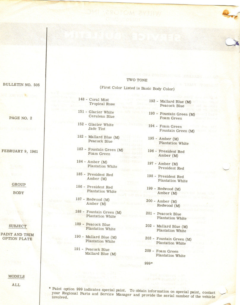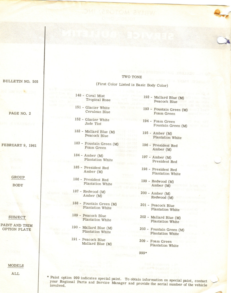 This March 1961 issue of Jeep Service and Parts News is, once again, four pages. Page three contains a couple items I found interesting. In the not-all-fc170-hubs-are-the-same department, in 1961 Willys Motors introduced reinforced drums. I’m unclear on ‘how much more’ these are reinforced. Also on page three we can pinpoint the introduction of the trim tag to early 1961. The article also mentions more information was included on Service Bulletin 505, which I’ve included at the bottom.