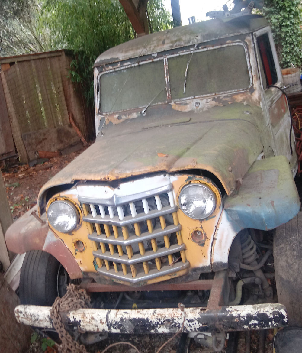 “I have a 51 Willy overland body bumpers cluster Windows sitting on a modern SUV . A project I let sit to long much time slip by and now my life has changed and I want to get it to someone who will make use of it been sitting undercover for many years body looks good overall”