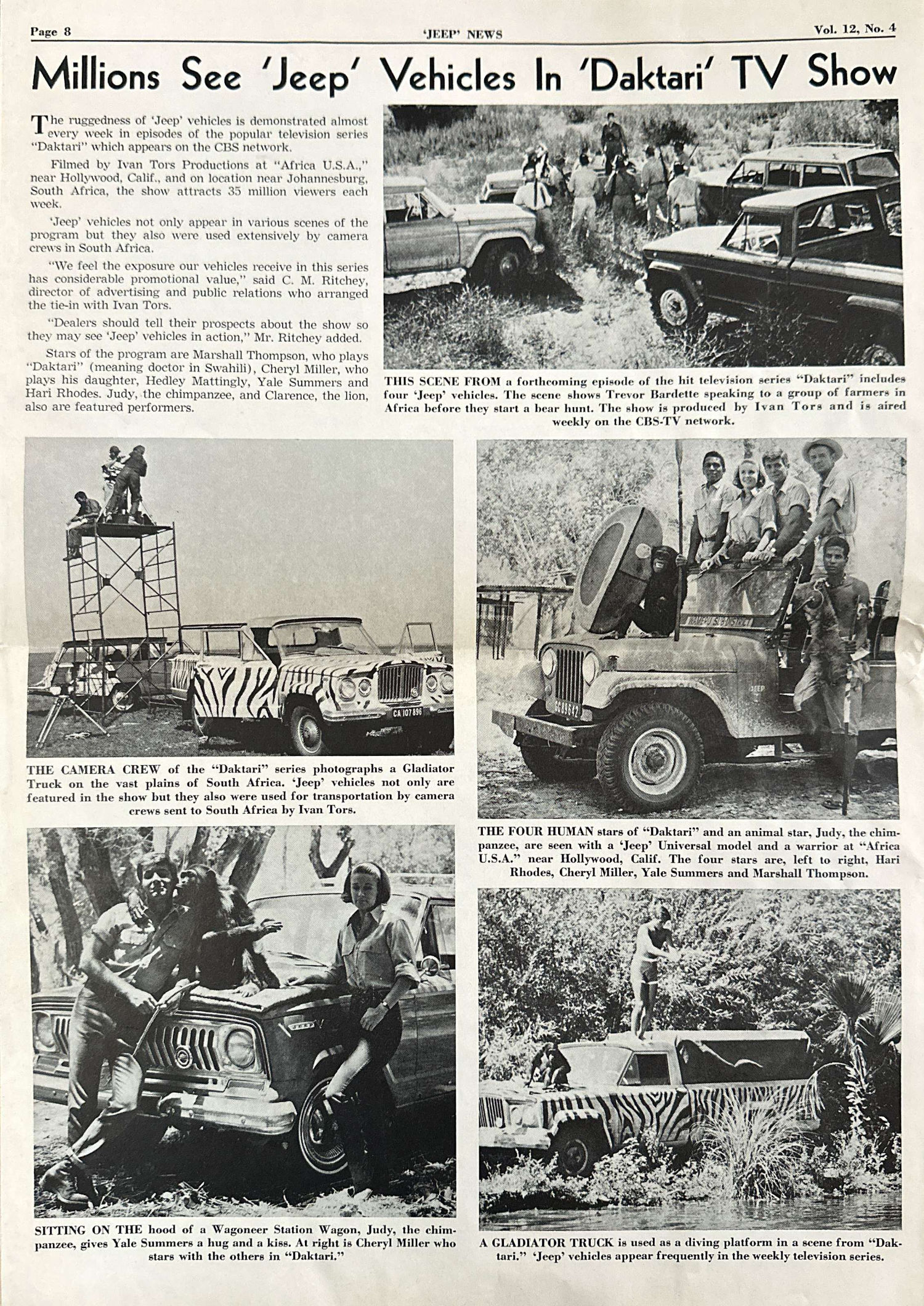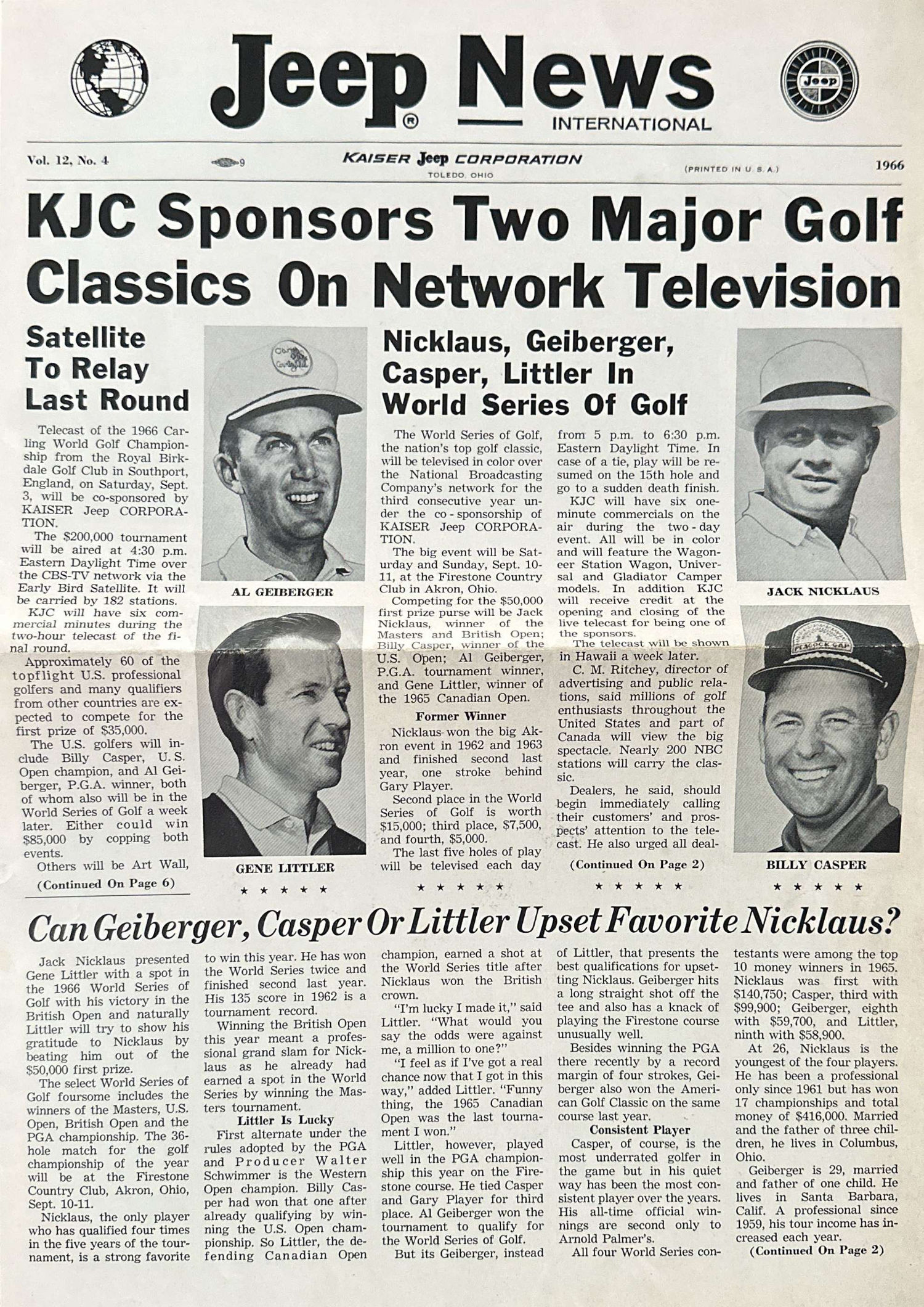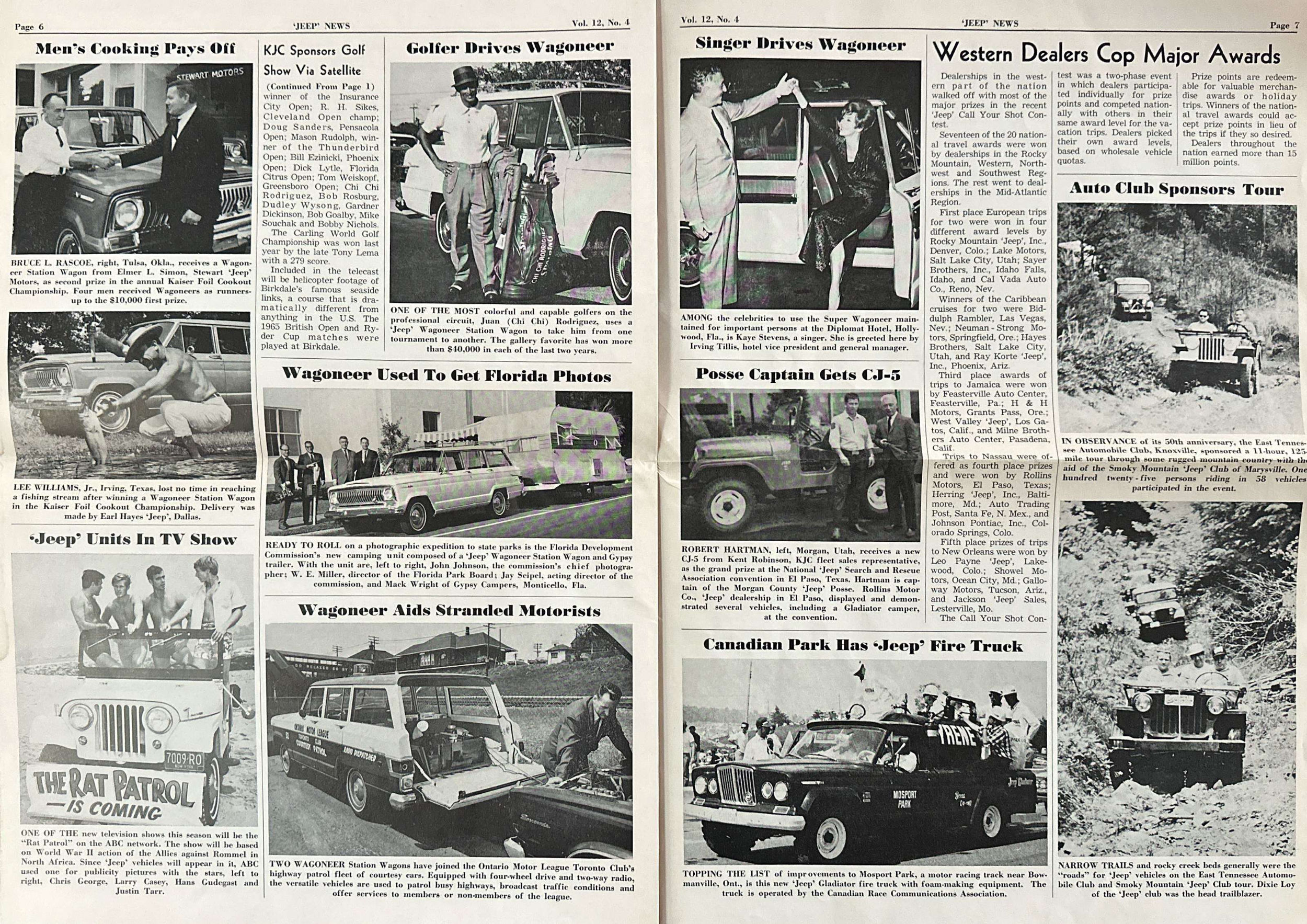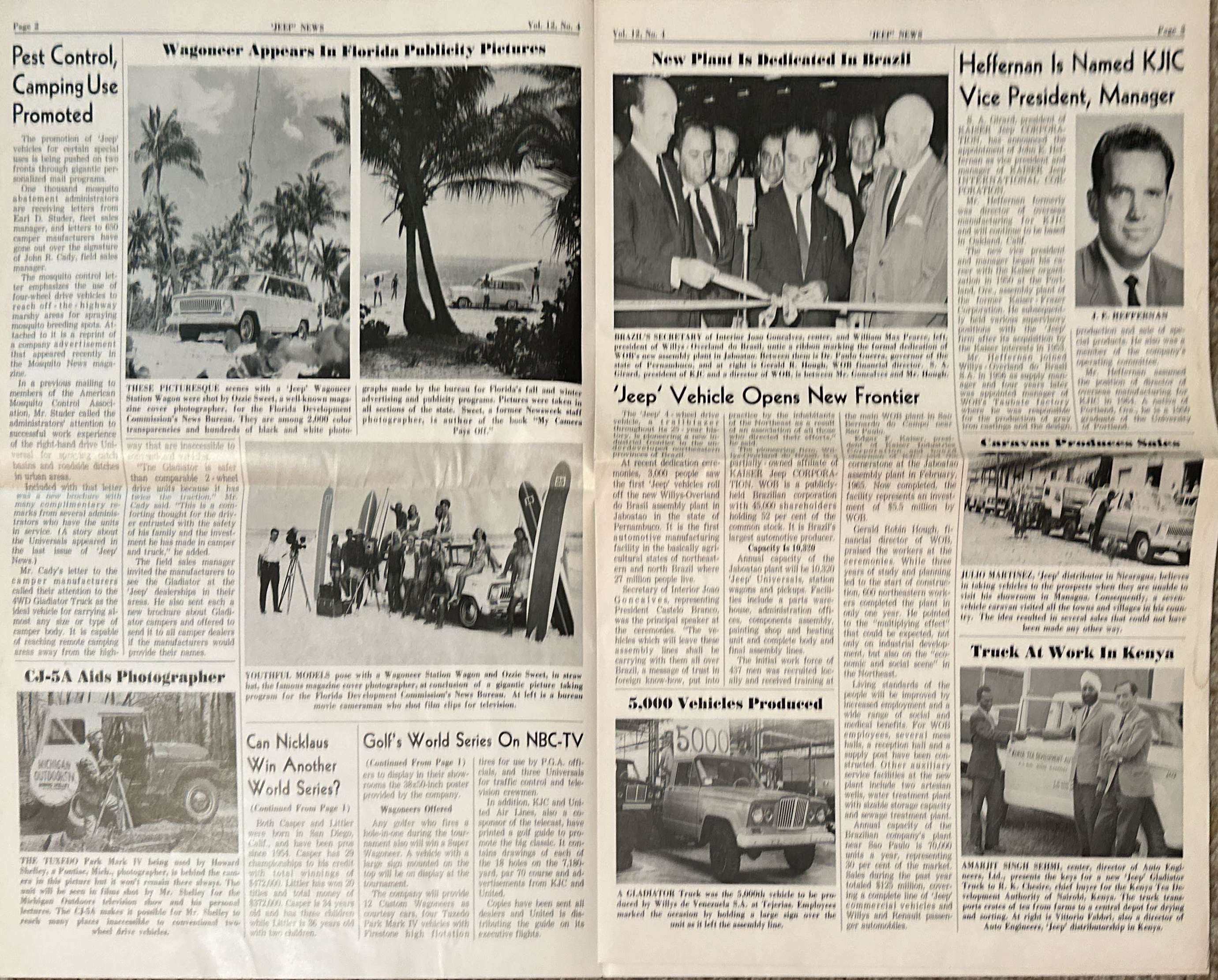 The eight-page 1966 Jeep News Volume 12 Number 4 announces on page one that KJC would be sponsoring two major golf games. This continues the KJC’s movements into shifting the jeep vehicles away from their utilitarian and agrarian roots, towards family, luxury and fun. That doesn’t mean there was no utilitarian promotion, as page two reported that KJC officials contacted one thousand mosquito abatement administrators to promote the jeeps. Curiously, next to that utilitarian article are three photos of jeeps on the beach with young adults and surfboards.
