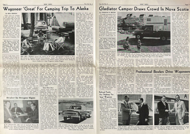 Page three goes international, with announcements from Brazil, Venezuela, Nicaragua, and India. Page four and five provide stories of travel. Page four published a travel piece to Alaska in a Wagoneer by Bill Thomas, who was a travel editor for The Cincinnati Enquirer. Page five showcases a report by Charles R. Meyer, a freelance writer from New York, who took his family on a trip to Nova Scotia in a camper-equipped Gladiator.