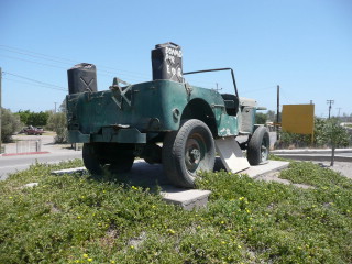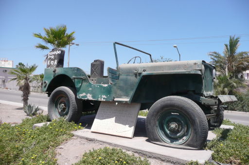 I ran across information about the above monument by Guillermo De Lara when he posted it to the Facebook page of Jeep CJ Mexico. There’s more history about this posted to this Baja thread: http://forums.bajanomad.com/viewthread.php?tid=31087. However, according to a book by Ann O’Neil, the actual jeep was a pickup and not an MB/GPW like that pictured. I’ve purchased the book and will update this post with the actual vehicle and the broader story.